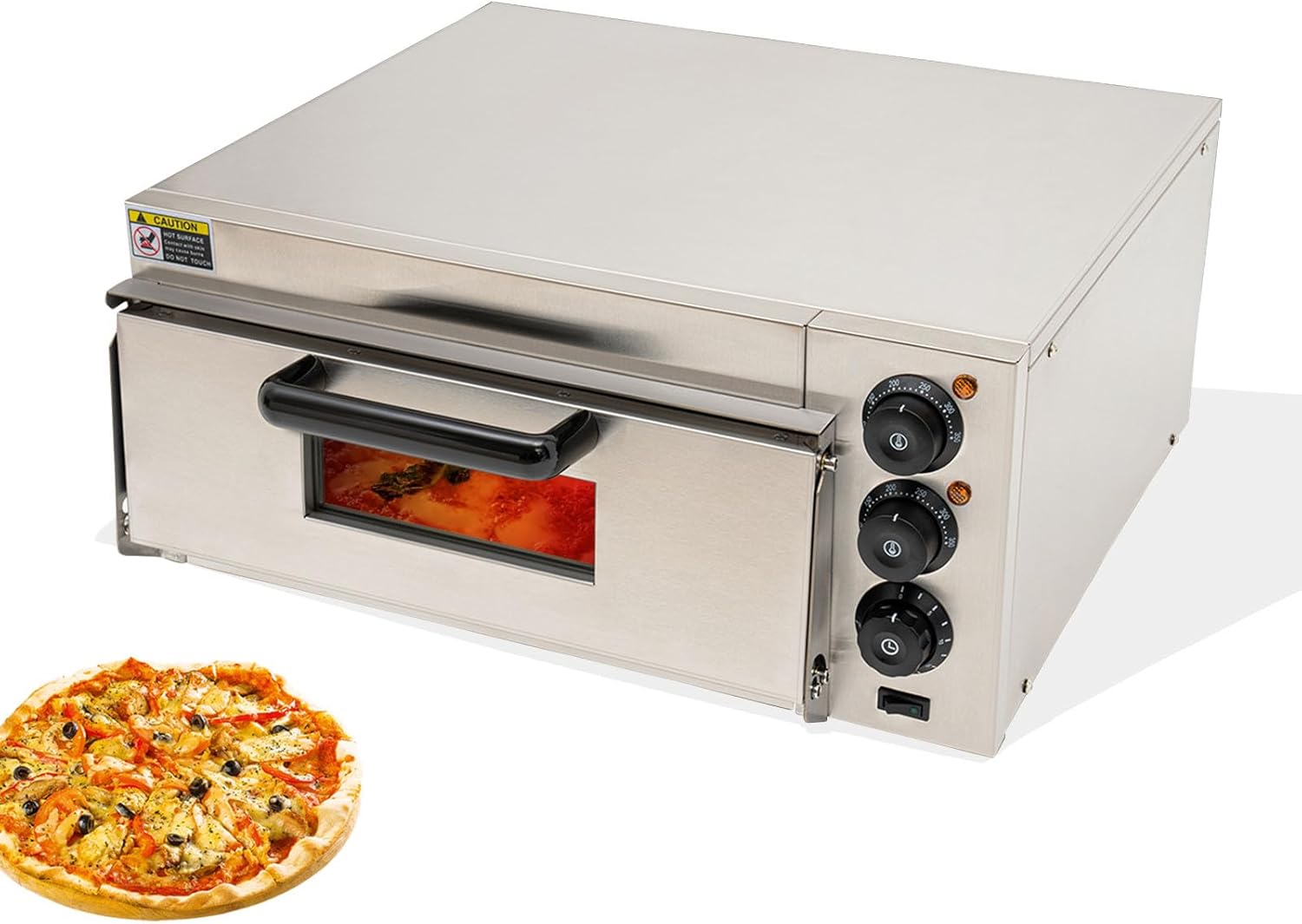 ❀Description:Do you like to DIY delicious pizzas? Our pizza oven is a helpful tool. It is made of premium materials, sturdy and durable. It is easy to operate, with large capacity, fast and evenly heating, so you can use it with confidence. It is designed to elevate your pizza-making experience. It combines advanced technology and various user-friendly features for more convenient use.❀Specification:Material: Iron, Bakelite, Tempered Glass, Rubber, 201 Stainless SteelProcess: PaintingColor: Black/SilverStyle: ModernShape: RectangularMount Type: CountertopAssembly Required: YesVoltage: 110V 60HzPlug Type: US StandardPower Source: Corded ElectricPower: 1800WTemperature Range: 50-350℃/122-662°FTiming Range: 0-30minCapacity: 20L/5.28galNumber of Tiers: 1Gross Weight: 27kg/59.5lbsNet Weight: 25.5kg/56lbsProduct Size: 57×47.5×27.5cm/22.4×18.7×10.8inPackage Size: 63×58×32.5cm/24.8×22.8×12❀Package Content:1× Pizza Oven1× Handle1 Pair× Gloves1× Flagstone1× English ManualNotes:1.Please read the product label and user manual carefully, and pay particular attention to the safety matters contained therein.2.Please wear heat-resistant gloves when taking out your pizza to prevent burning your hands.3.Please allow the slight color difference caused by the shooting light and 1-3cm error due to manual measurement, and make sure you do not mind before you order.