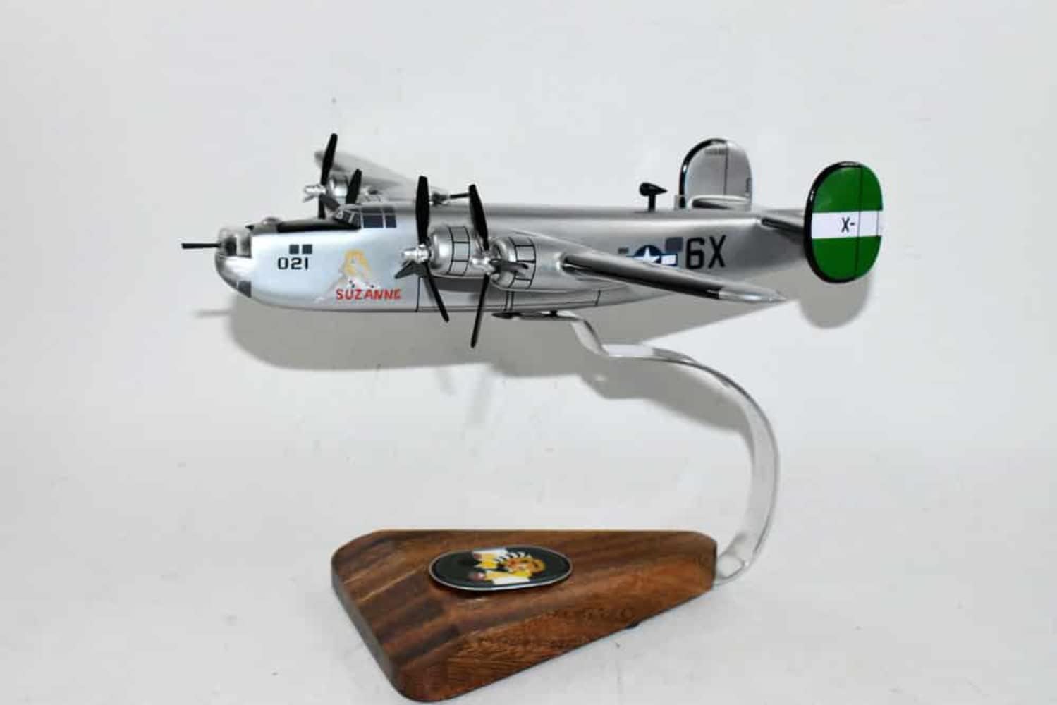 491st BG, 854 BS Suzanne B-24L ModelFly with the 491st BG, 854 BS Suzanne in this hand crafted B-24L Model. Each piece is carefully carved from wood and hand painted to provide a piece you’ll love.The 854th Bombardment Squadron is a former United States Army Air Forces unit. It was activated in October 1943 as a heavy bomber unit. After training in the United States, the squadron deployed to the European Theater of Operations, where it participated in the strategic bombing campaign against Germany, earning a Distinguished Unit Citation in an attack against Misburg. Following V-E Day, the squadron returned to the United States and was inactivated at McChord Field, Washington in September 1945.History Training in the United States The 854th Bombardment Squadron was activated 1 October 1943 at Davis-Monthan Field, Arizona as one of the four squadrons of the 491st Bombardment Group. The following month, the squadron moved to El Paso Army Air Field, Texas and began training with Consolidated B-24 Liberator heavy bombers.[2][3] In January, most of the ground echelon of the squadron was withdrawn and reassigned to Boeing B-29 Superfortress units being organized by Second Air Force, with the largest group moving to Pratt Army Air Field, Kansas. Many of the unit’s remaining personnel were transferred to other B-24 groups as well, and by the end of December, the squadron had no assigned aircraft.[4] While the air echelon continued training in the United States, Eighth Air Force began organizing a new ground echelon in England, directing each of the four groups assigned to its 2d Bombardment Division to form a squadron ground echelon.[5][note 2] The air echelon moved to Pueblo Army Air Base, Colorado to complete its training with the 471st Bombardment Group.[4] Key personnel of the unit departed the United States on 11 April, while the crews began ferrying the squadron’s B-24s via the southern ferry route on 21 April.Combat