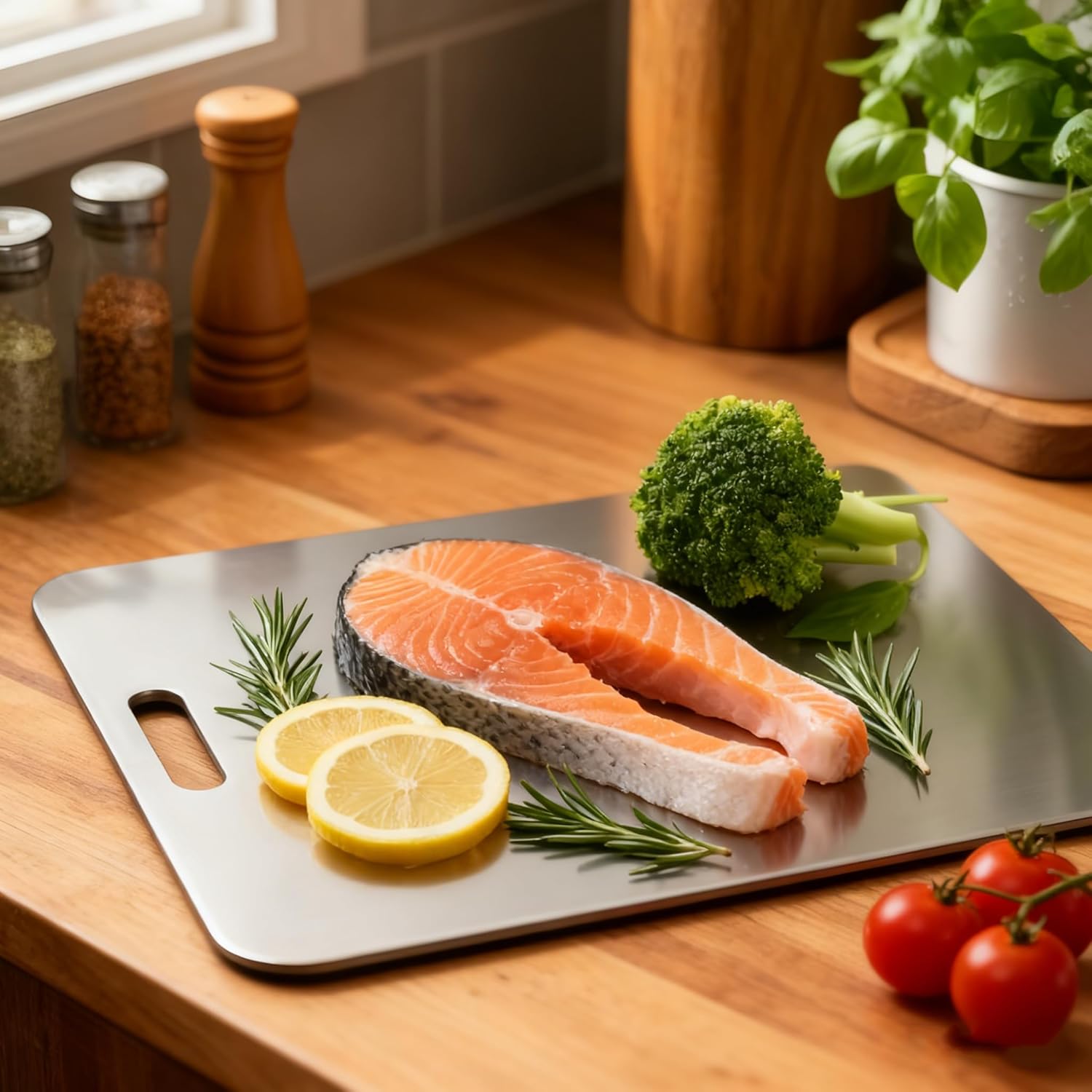 Experience the next generation of kitchen hygiene and durability with our Titanium Cutting Board Set of 4. Each 100% pure titanium cutting board is crafted for home cooks and professional chefs who value health, safety, and performance. Unlike traditional plastic, wood, or bamboo boards that absorb moisture, trap odors, and wear out over time, this pure titanium cutting board provides a non-porous, stain-resistant, and ultra-hygienic surface that stands the test of time. Made from medical-grade titanium, the cutting board titanium design offers exceptional hardness while remaining lightweight and easy to handle. Whether you’re slicing meat, dicing vegetables, or chopping fruits, this titanium cutting board for kitchen guarantees precision and peace of mind. Each titanium cutting board set of 4 includes four practical sizes:15.3""x11"", 13.4""x9"", 11.8""x7.8"", and 9.4""x5.9"" — perfect for every cooking task, from meal prep to outdoor grilling. Use the titanium cutting board large for heavy-duty chopping and the smaller boards for quick kitchen jobs. The double-sided design allows you to separate meat, fruits, and vegetables easily, keeping your food safe and fresh. Cleaning is effortless. The 100% titanium cutting board is non-porous and dries instantly after rinsing. Simply wipe with water or place it in the dishwasher — no oiling, scrubbing, or soaking required. Its smooth surface ensures no hidden residues, maintaining a spotless and odor-free prep area. Plus, the titanium material resists corrosion and oxidation, offering long-lasting beauty and functionality.Gentle on knives, yet strong against cuts, the pure cut titanium cutting board helps preserve blade sharpness — a major improvement over glass or ceramic boards. With rounded corners and polished edges, it’s safe to handle and adds a refined touch to your kitchen decor.Ideal for both indoor and outdoor use, this titanium cutting board set is versatile, portable, and elegant. Take it camping, to picnics, or on road trips — it’s tough enough for outdoor cooking and sleek enough for modern kitchens. Also known as tabla de picar de titanio puro , this board represents the perfect blend of hygiene, durability, and modern design. Whether you’re preparing family meals or crafting gourmet dishes, our 100% pure titanium cutting board delivers superior performance and style. Upgrade your kitchen with a cutting board built to last a lifetime — clean, sustainable, and engineered for excellence.