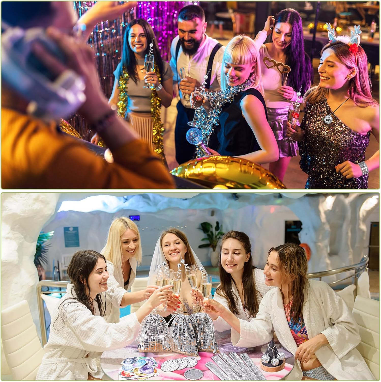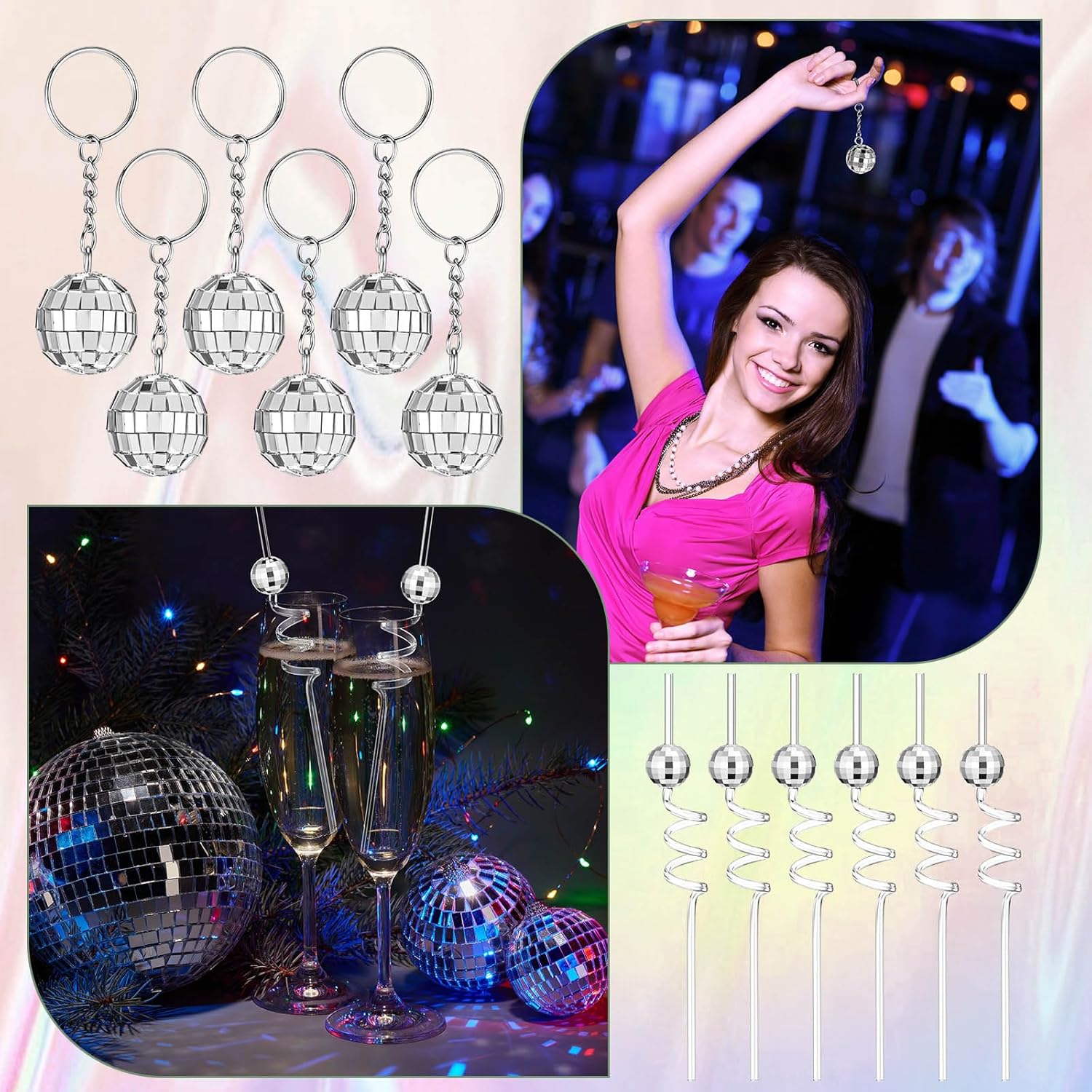 Features: This retro chic gift set is fully equipped to meet all party needs of disco enthusiasts, ensuring a spectacular celebration filled with unforgettable disco experiences. Ideal for those who seek to reexperience the dazzling glamour of the Disco era. Our disco ball decorations, suitable for users over 14 years of age, foster a youthful energy in the party environment, making celebrations livelier and memorable. Specifications: Material: quality material Main color: silver Size: Disco ball keychain: about 1.18 inches Scrunchie: about 7.87 x 5.9 inches Slap bracelet: 8.3 x 1.2 inches Diameter of compact mirrors: about 2.76 inches Package includes: 6 x Scrunchies 6 x Compact mirrors 6 x Disco ball keychains 6 x Straws 6 x Slap bracelets 50 x Disco stickers 6 x Necklaces 6 x Bags Notes: Manual measurement, please allow slight errors on size. The color may exist a slight difference due to different screen displays. Suitable for people above 14 years old.