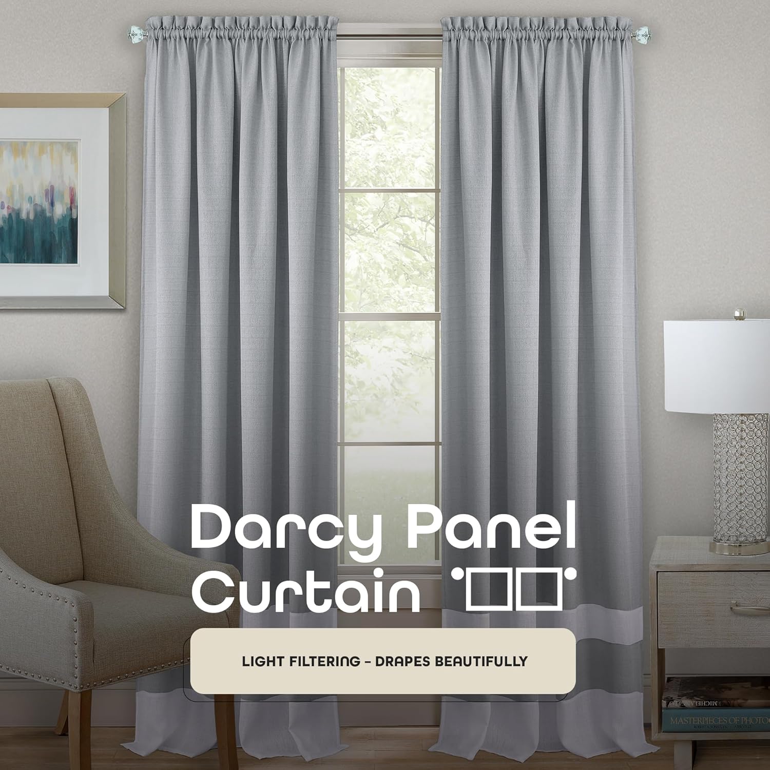 Curtain Panel: The Darcy Rod Pocket Window Curtain Panel is a contemporary triple engineered banded panel in contrasting colors, giving it a classic look. This rod pocket curtain is great on its own or paired with our matching Darcy collection. Color: Grey/White.