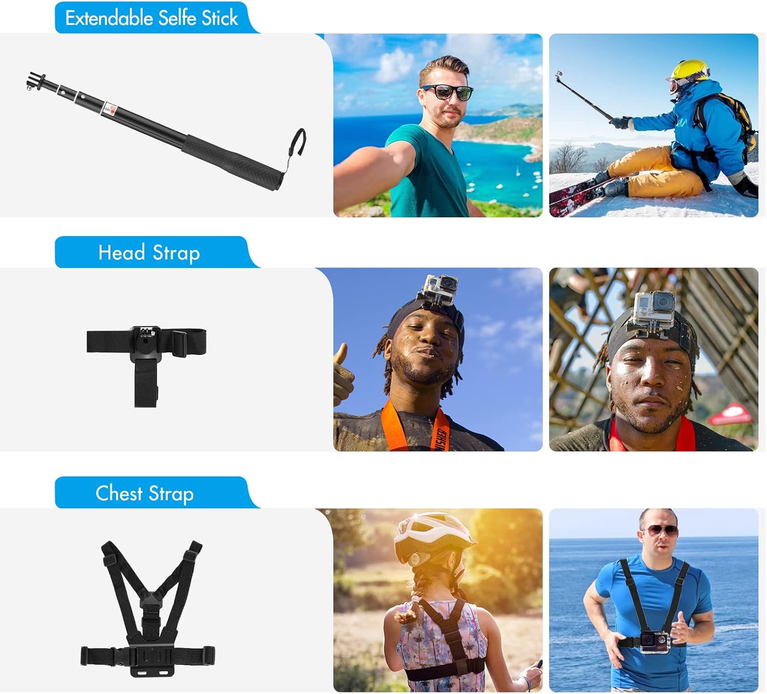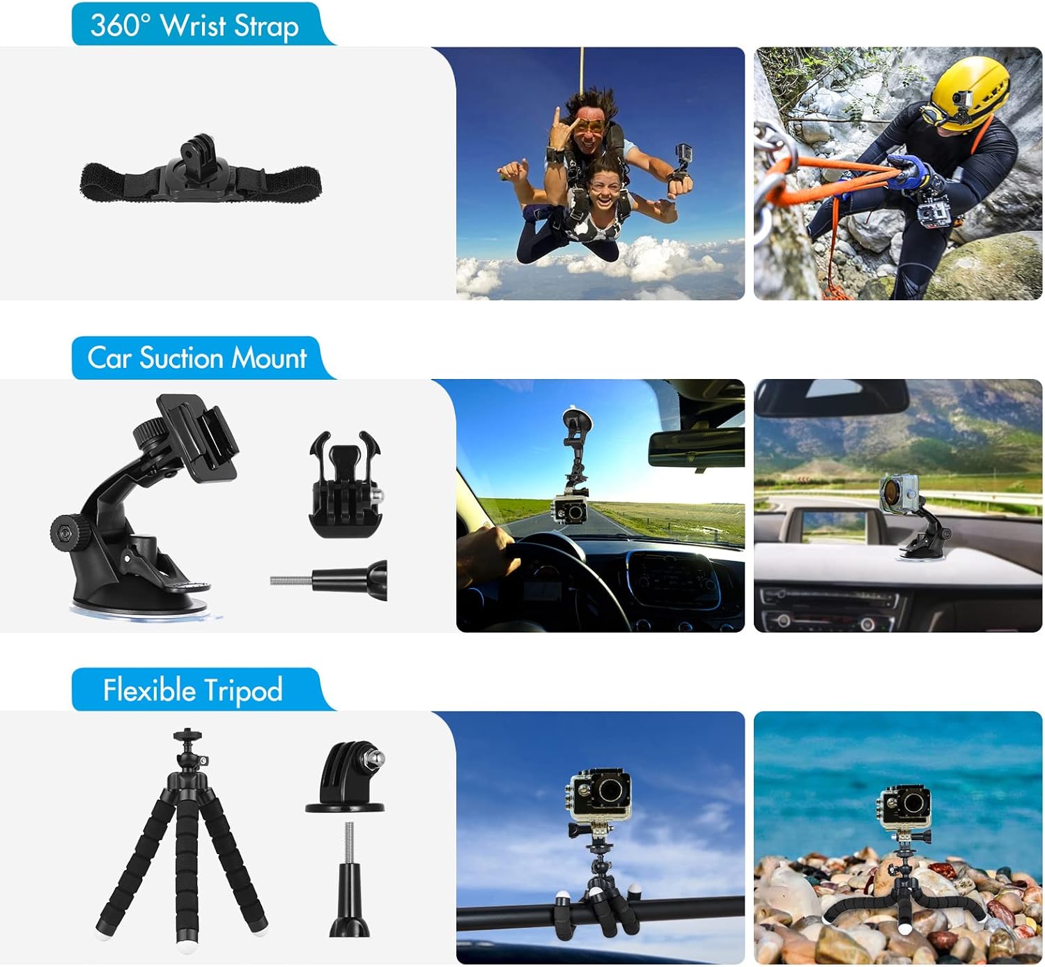 【Waterproof Housing & Silicone Protective Case】The waterproof housing supports 50M waterproof level, which can protect your camera when diving in deep water; and the silicone case provides full protection to your camera during extreme sports, safe and reliable. 【360° Rotating Wrist Strap + 360° Rotating Clip Mount】Wrist strap for fixing your action camera to your wrist easily, and clip mount to clip your action camera stably to backpack strap, and 360° rotation design allows you to adjust capture angle flexibly. 【Adjustable Head Strap + Chest Strap】Helps you record videos at first-person point of view and enables you to breath well during sports; Fully adjustable to fit a wide range body types, stably capturing wonderful moments with your action camera. 【Car Suction Mount + Bicycle Handlebar Mount】Car suction mount allows you to attach action camera to car windscreen, and bicycle handlebar mount to install the action camera to bike or motorcycle handlebar stably, just record your self-driving journey freely. 【Extendable Selfie Stick + Mini Octopus Tripod】Using the extendable selfie stick, you can take perfect pictures anytime and anywhere, suitable for selfie and group photos; the mini octopus tripod can work with smartphone also, you can use it as a desktop tripod for video watching, live streaming, etc. 【Large Carrying Case for Convenient Storage and Carry】Comes with a large ty carry case, you can put all of the accessories into the case for convenient storage, and top carry handle design make it easier for you to carry the accessories. Specifications: Main Color: Black Material: Plastic + Nylon + Silicone Packing List: 1 * Sports Camera Accessories Kit 1 * Carry Bag