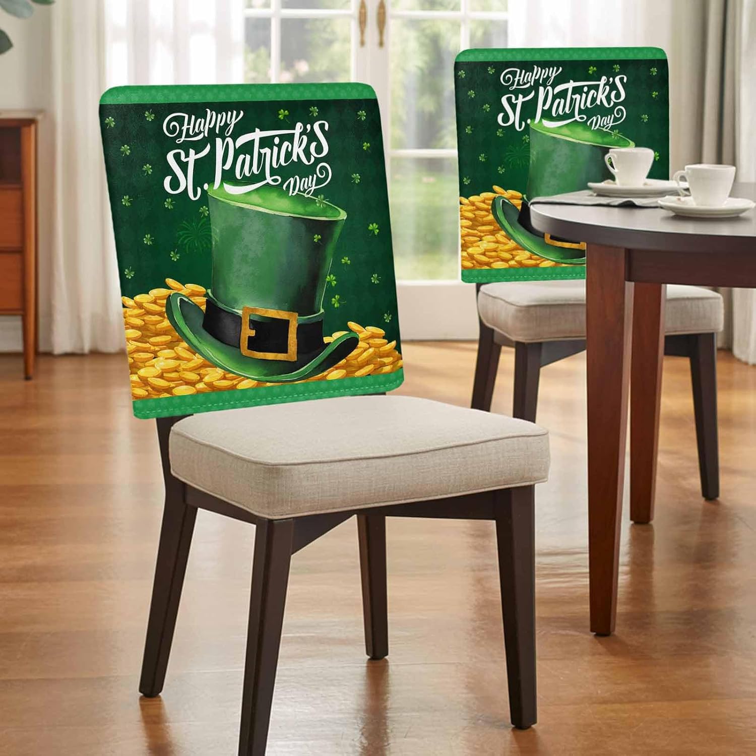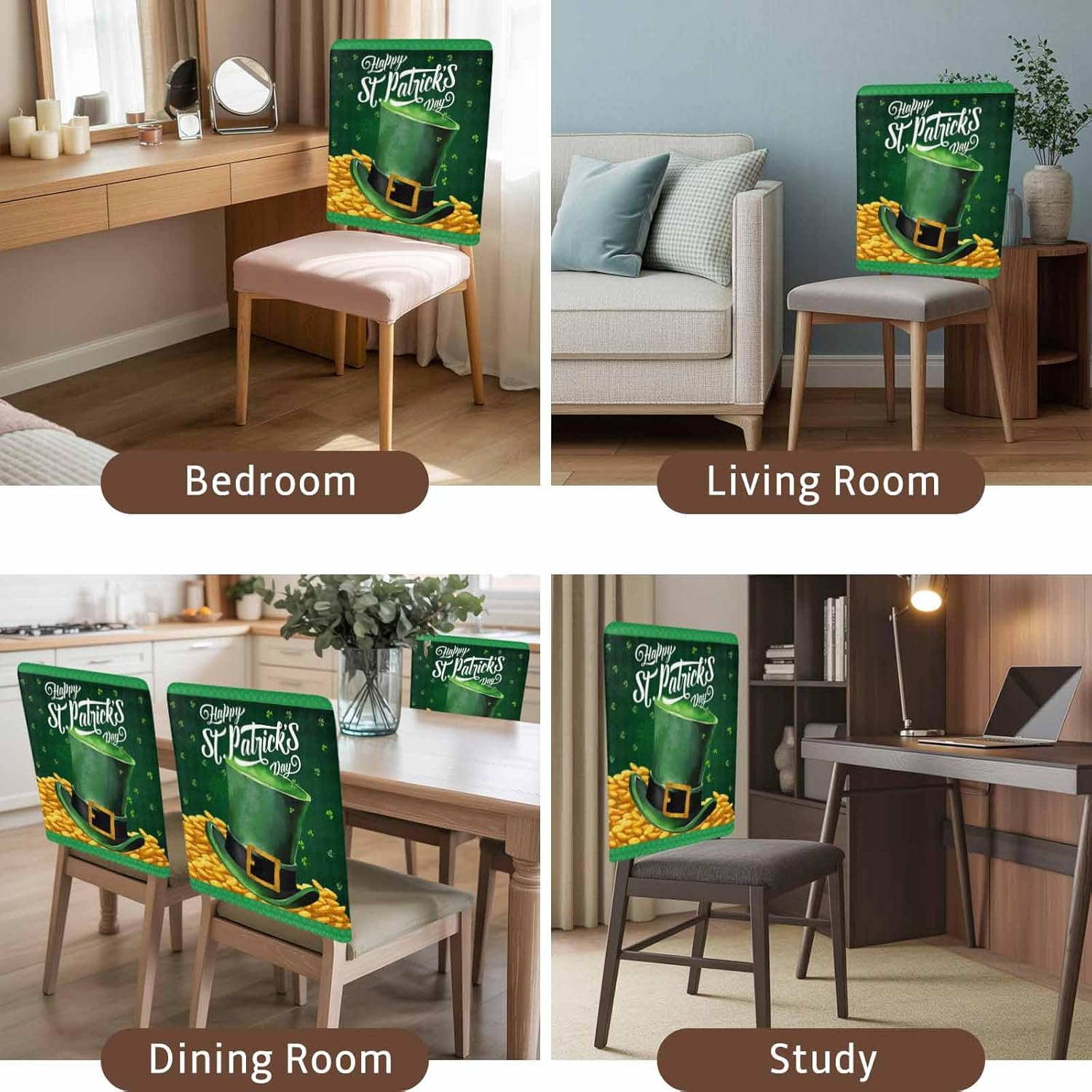 St. Patrick's Chair Back Cover Make your interior decor a new look Stretch dining chair cover fit for normal and high back parson chair. Use our chair covers can transform your old chair to brand new, freshen up your interior decor. Feature Stretchy and Soft: High persistence soft polyester spandex yard fabric, super stretchable, soft, comfortable, durable and wrinkle resistant for most chairs. Protections and decorating your chair: Protect your chair from stains and make chairs look brand new, also complements any decorating style. Widely Use: The chair cover can be used for hotal, wedding, banquet, dinner, meeting, celebration, ceremony, family dining room decoration, etc. Suitable for Chair Size Chair Back Height 18-22 inches Chair Back Width 14-20 inches Washing Removable dining chair slipcovers can be washed by hand or machine. Use mild detergent. Do not bleach. No ironing is required. If you aren't satisfied with your purchase, any problem please contact us first time. We will offer the best solution to you.