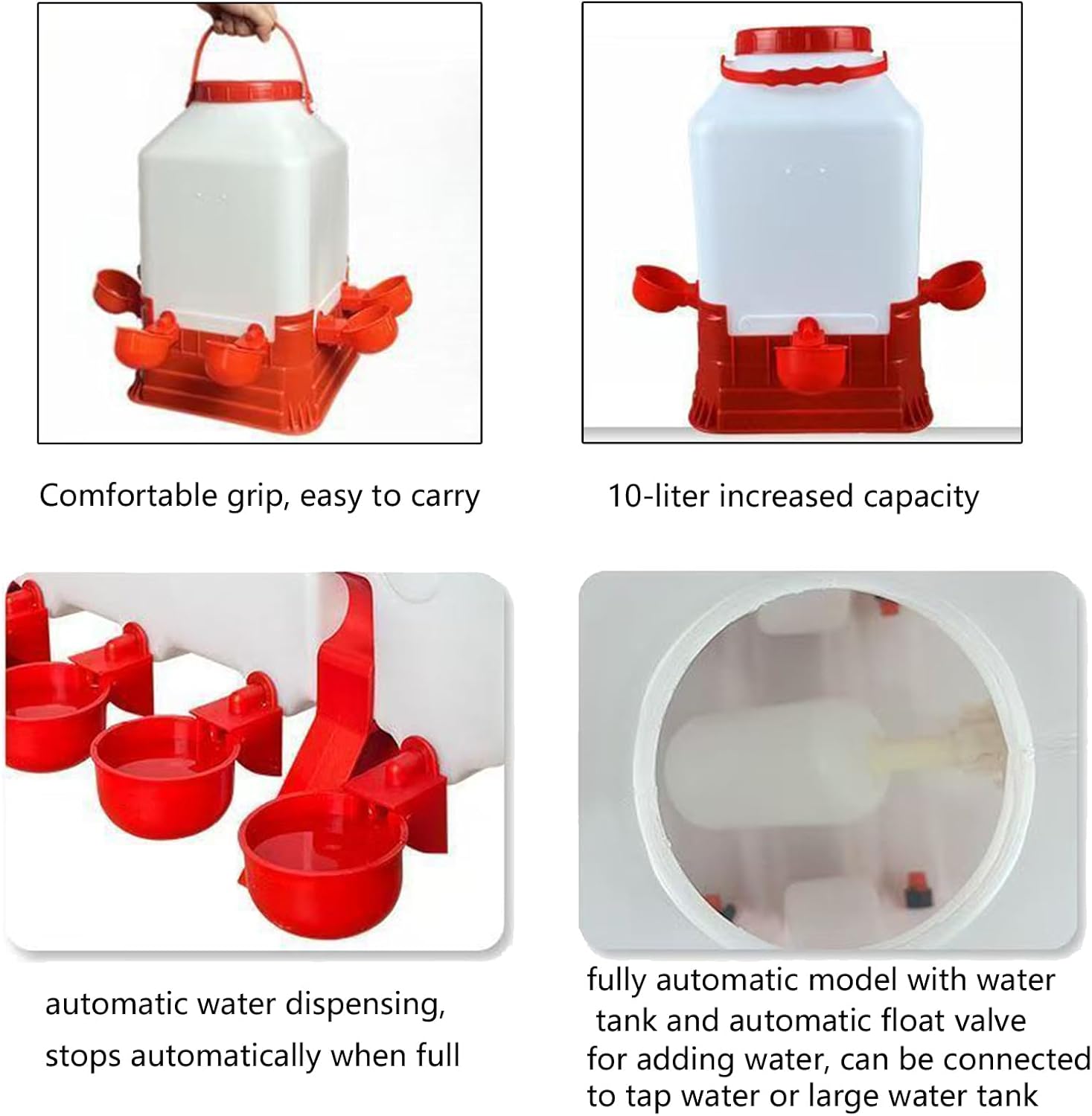 Chicken Feeder Waterer 10L Water Dispenser Feeding With Antispill Design for Poultry Coops Feeding Watering Use Features: and This automatic poultry feeder / waterer features a 10L water capacity with selfregulating supply, maintaining freshed provisions for long time while reducing feed waste through spillproof design Engineered with 4 / 8 drinking cups, the construction includes antiperching lid, leakproof gaskets, and pre drilled hole for quick installation in coops or backyard farm Great for hobby farmer and busy homesteaders, this poultry feeding systems simplifies poultry care through its automated food dispensing and water circulations mechanisms The stable base design ground, making it perfect for chicken coops, ducks pens, and poultry requiring feeding great Complete with hanging hook, mounting brackets, and weather component, this feeder waterer ensures year round reliability across season while keeping bedding dry through its sealed drainage systems Specifications: Component: Product Size: As pictures shown Type: 5 optional type as pictures shown Package Includes: 1PC Poultry Feeder Note: Please allow 0-1cm error due to manual measurement Due to the differences between different monitors, the picture may not reflect the actual color of the item