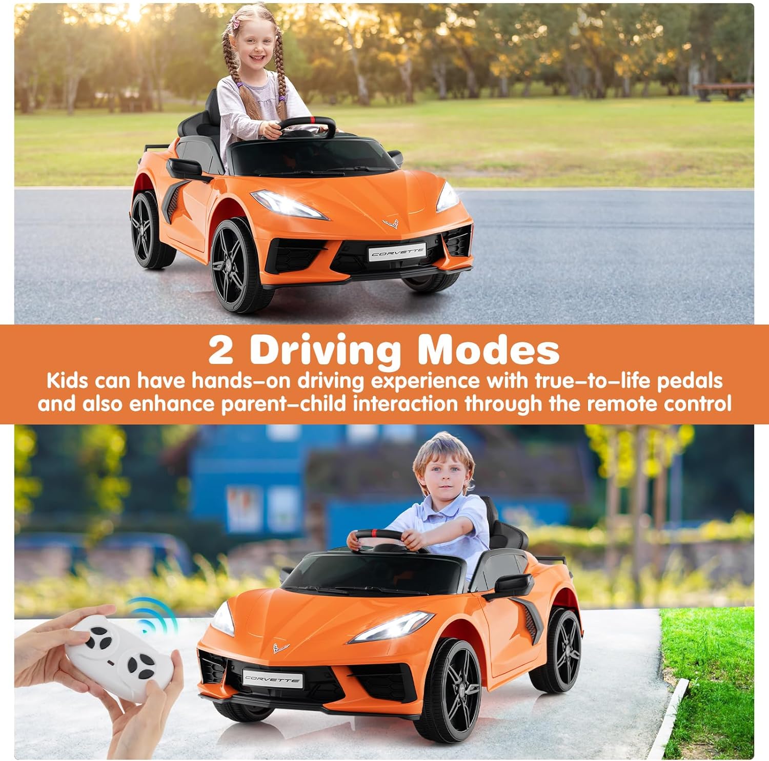 Description:Let your sweetie enjoy thrilling driving with our 12V electric kids ride on car!!!This licensed Chevrolet Corvette C8 vehicle car has a steering wheel and media center for horn, music, ultra-low battery warning sound, and wireless connection. Kids can manually start the car with the power switch, and move forward or backward with the forward & reverse switch. For younger children, the electric car comes with a remote control for parents to control it to promote parent-child interaction. Plus, with 2 12V 30W motors and a 12V 4.5AH battery, the toy car can be driven at 1.6-2.5mph/ 2.5-4km/h speed range. Compared with normal start, the slow start and slow stop functions of this car ensure kid’s driving safety. More importantly, this kids car features 4-wheel spring shock absorbers for great safety and stability, which is also ASTM compliant and CPSIA certified.Features:Slow start and slow stop system to prevent sudden acceleration or emergency brake2 lockable doors, 2 LED headlights, 1 lighted dashboard, and 1 cool rear wing for a realistic appearanceEquipped with 2 driving modes, including kids’ manual operation and parental remote controlRemote control with 3 speeds for parents to provide kids with guidance4-wheel spring shock absorbers allow kids to drive with safetyAchieves acceleration with the foot pedalComes with a music player to play music and adjust the volume2 x 12V 30W motors and 12V 4.5AH battery for 1.6-2.5mph/ 2.5-4km/h speedASTM compliant and CPSIA approved for excellent safetyDesigned with ultra-low battery warning sound, battery display, and adjustable volumeWireless connection, horn, and music brings hours of funSafety belt to firmly fix your child into the seat12V 0.5A charger and built-in charging port for easy chargingSpecifications:Color: Orange/ Pink/ Red/ WhiteMaterial: PPProduct Dimensions: 41.5” x 25” x 19” (L x W x H)Seat Size: 13.5” x 8” (W x D)Backrest Height: 10.5”Battery: 12V 4.5AHMotor: 12V 30 W x 2Charger: 12V 0.5ASpeed: 1.6-2.5 MPHCharging Time: 8-12 HoursSuitable Age: 3+ Years OldWeight Capacity: 66 LBS/30 KGNet Weight: 27.5 lbsPackage Includes:1 x Kids Ride On Chevrolet Corvette Car1 x Remote Control1 x Charger1 x User Manual