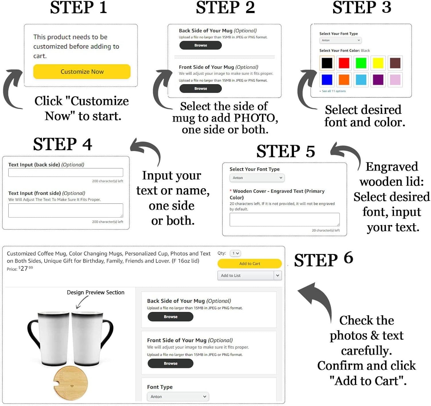 • CUSTOMIZED FREELY: Click "Customize Now" to start creating your own design. You can upload your photos, logos, text, and print one or both sides.The wooden cup cover can also engrave your words.