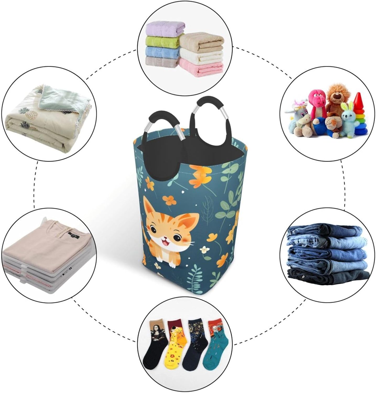 Our Cute kitty dirty clothes storage bag is made of polyester, which is lightweight and flexible. It can maintain a stable shape even under heavy pressure and collision. At the same time, the incorporation of Oxford cloth material significantly improves the durability of the product, and it is resistant to wear, bumps and pulling. The storage bag is designed with a large capacity, which can easily carry winter clothes, daily clothes and a variety of sundries. It is easy to carry and store, and fits tightly into the gap of the suitcase after folding. The aluminum handle is sturdy and reliable, supports hanging, and is suitable for a variety of places. In terms of design, it adopts leak-proof technology, combined with waterproof coating and precision sewing, which is effectively waterproof. The exterior uses cutting-edge transfer technology, and a PE board support is added at the bottom to ensure stable load-bearing and prevent tipping. This storage bag is practical and easy to use, and is an ideal choice for travel and home.