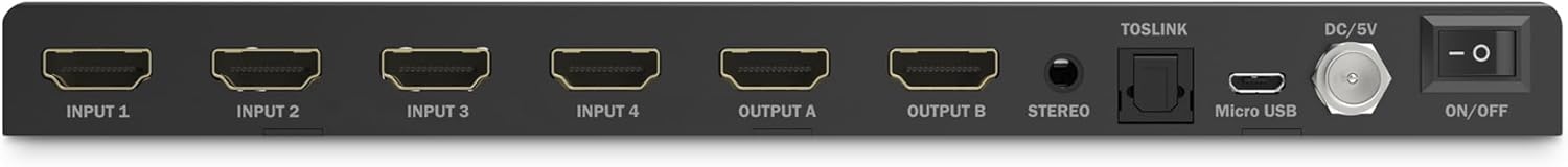 The DIGITUS® 4x2 HDMI Matrix Switch / Quad Multi-Viewer enables convenient switching between up to 4 HDMI sources and 2 playback devices; distribute your media content independently. Conveniently switch between signal sources with the help of the remote control, on the same device or via an RS232 control. The Multi-Viewer function offers 6 modes for individual representation of sources (split screen, PIP) to output A or A and B in parallel. It is also possible to decouple audio signals via Toslink or a 3.5mm stereo connection and play them separately. Resolutions up to 4K/30Hz are supported. The HDMI output resolution can be individually adapted using a scaler.