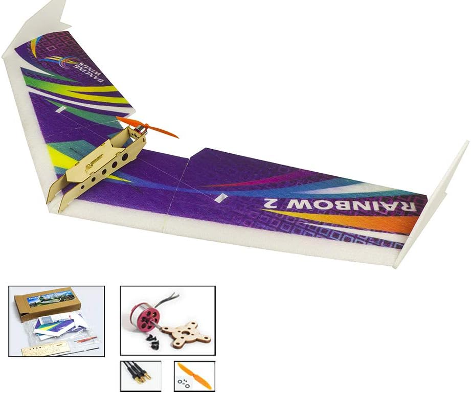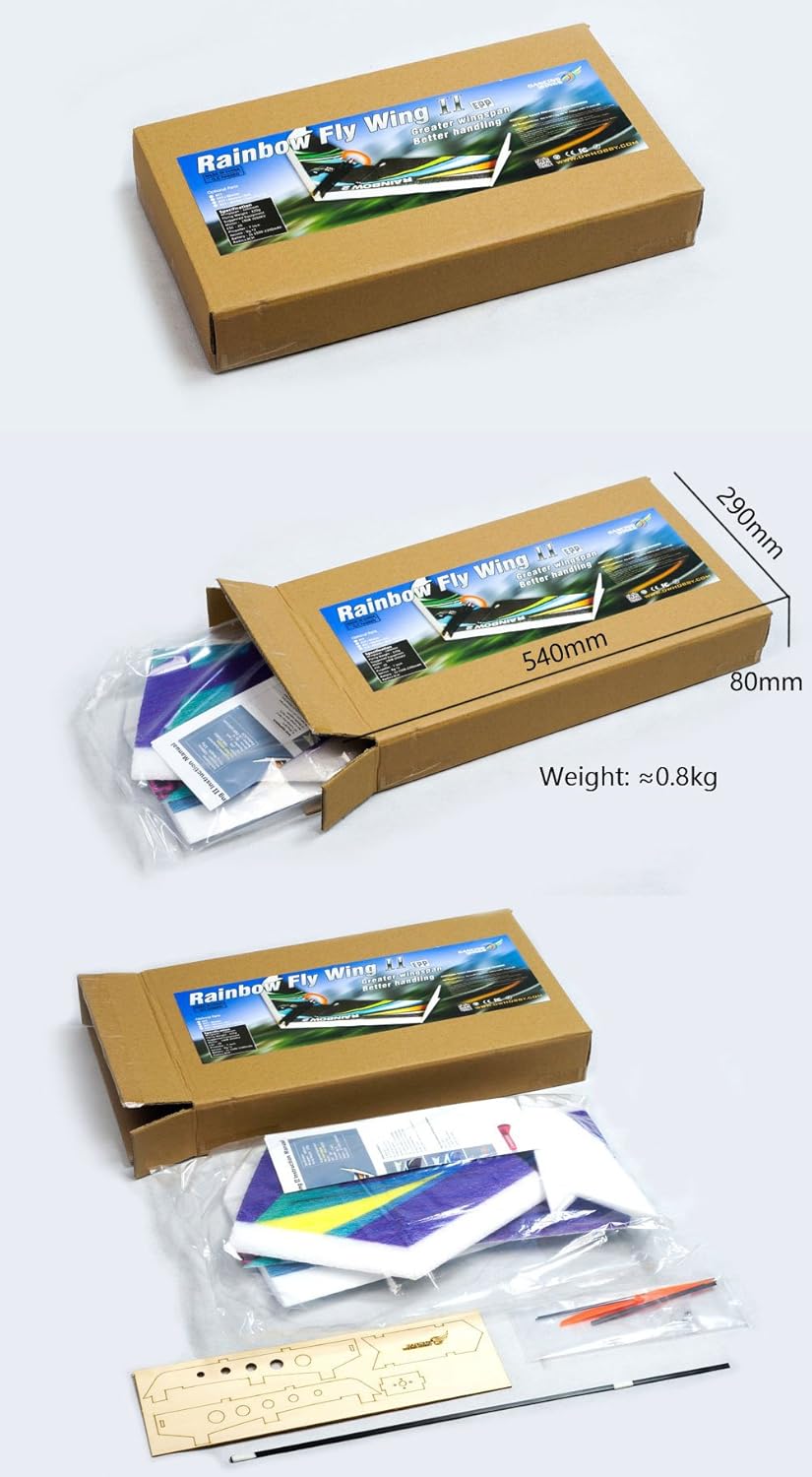Flying Video:https://www.youtube.com/watch?v=KlcxeTMqe9Y Features: Ultra light and durable EPP construction,and not easy to break Slow stable fly due to the large wingspan Training aircraft is easy to operation even for beginners Easy to build your aircraft via assembly drawings Specification: Wingspan: 1000mm Length: 365mm Flying Weight: 320g Suggested Power System: Motor: MM1908 2050KV ESC: 20A Servo: 9g *2 Propeller:7035 BATT: 2S 800mAh (Not incl.) E0601=E06 1000mmRainbow Fly wing II KIT +Prop 7035 E0602=E06 1000mmRainbow Fly wing II+Motor(1908 2050KV+3.5mm Banana Male Plug+3.0mm Prop Saver) E0604=E06 1000mmRainbow Fly wing II+Motor+ESC(20A E-Power+3.5mm Banana Female Plug+JST Plug)+Servo(9g*2) E0604-L10=E06 1000mmRainbow Fly wing II+MM1908 2050KV+20A ESC+9g*2+Transmitter: Hot RC HT-8A (Left throttle)+Receiver: F08A 8CH E0604-R10=E06 1000mmRainbow Fly wing II+MM1908 2050KV+20A ESC+9g*2+Transmitter: Hot RC HT-8A (Right throttle)+Receiver: F08A 8CH