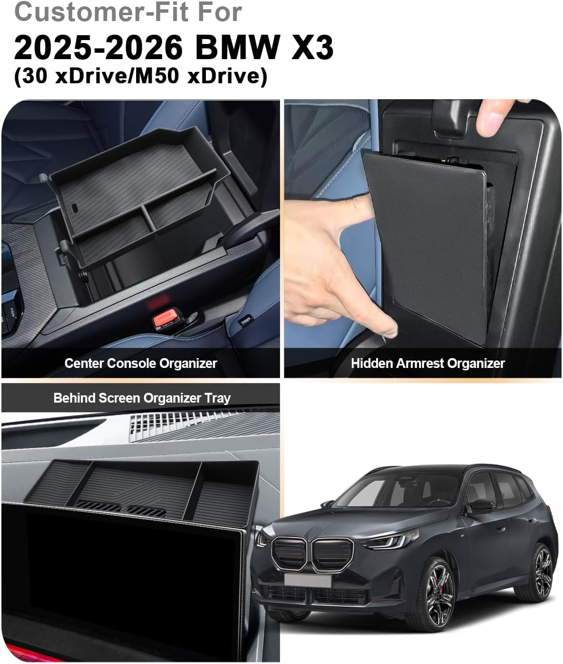Center Console Organizer for 2025-2026 BMW X3 - Premium Organizer to Maximize Interior Storage & Keep Your Car TidyMaximize the storage capacity of your 2025-2026 X3 with our premium armrest box organizer. This innovative organizer tray is designed to optimize space and help you keep your X3’s interior neat and clutter-free. No more loose items or messy interiors—this storage solution is the ideal accessory for anyone looking to make the most out of their X3's available space.Key Features:Perfect Fit for 2025-2026 BMW X3 - Tailored to precisely fit your X3's armrest compartment, offering a seamless integration without the need for modifications.Enhanced Storage Capacity - This center console organizer provides extra room for your essentials such as phones, coins, sunglasses, and other small items, reducing clutter and improving convenience.Durable & High-Quality Construction - Made with premium materials to withstand daily use, this storage box is built to last while maintaining a stylish, sleek look that complements your X3’s interior.Easy to Install - With a simple, tool-free installation process, it’s designed to fit effortlessly into your 2025-2026 X3. Just place it into your armrest compartment and enjoy a more organized vehicle in seconds.Universal Solution - Whether you're on a road trip, commuting, or driving the family around, this armrest organizer is the perfect companion for a stress-free, organized driving experience.This center console organizer is an essential accessory for 2025-2026 BMW X3 owners looking to enhance their vehicle’s organization while increasing storage space. Say goodbye to the mess and hello to a cleaner, more organized X3 today!