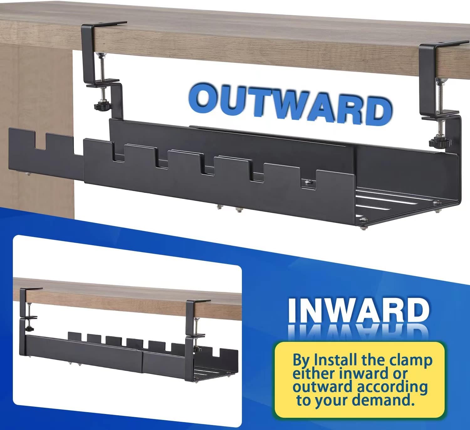 Retractable Under Desk Cable Management Tray, Clamp Mount, Sturdy Metal, No Drill, Max load 22lbs, Cord Organizer for Home And Office, Black
