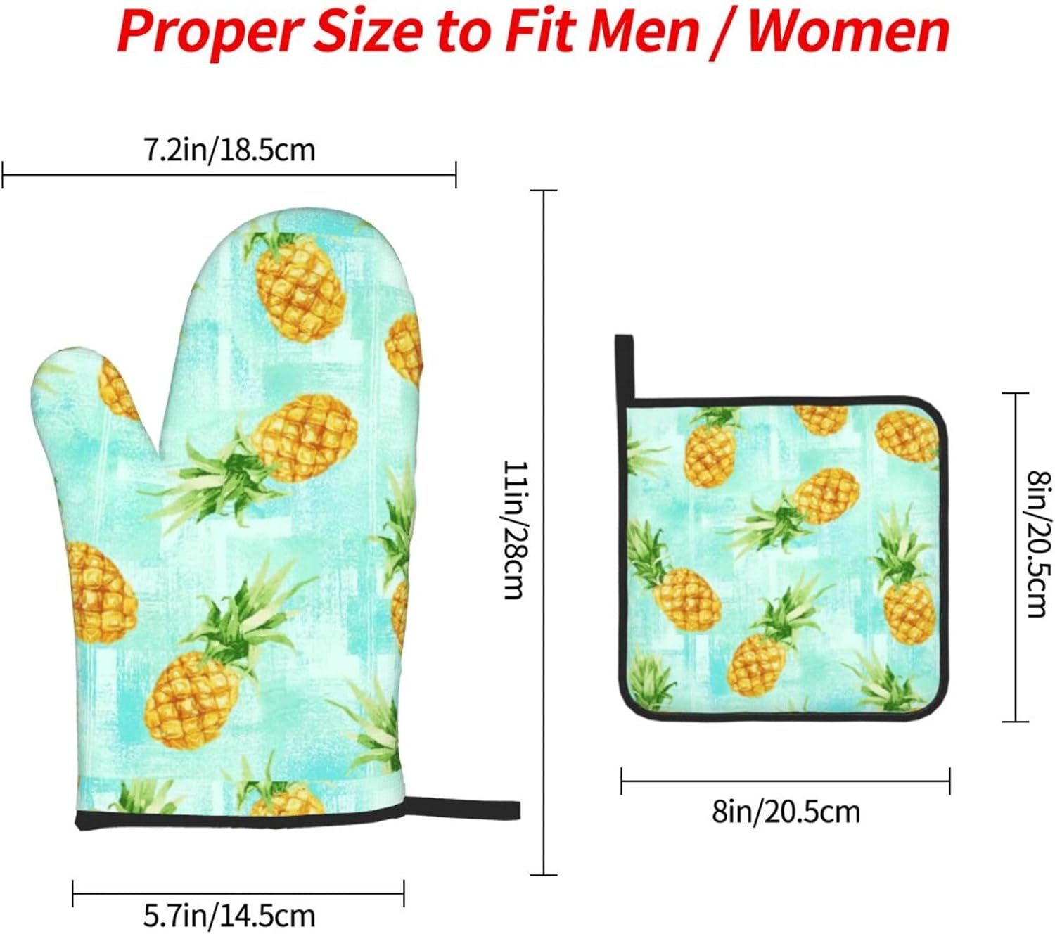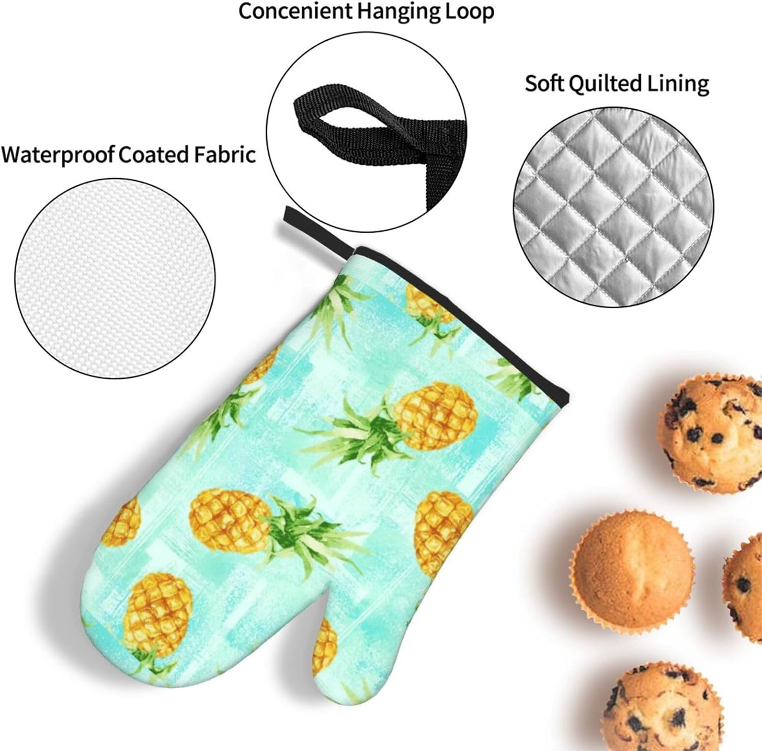 upgrade your kitchen safety with this Green pineapple. print microwave gloves, oven mitts and pot holders sets. crafted from water repellency polyester and heat-resistant fabric, these kitchen baking three piece set offers reliable protection for hands while handling hot items. the double-layer waterproof design ensures easy cleaning after use. suitable for various cooking scenarios including microwave ovens, conventional ovens, stovetop cooking, and outdoor grilling. the side hanging rope allows convenient storage when not in use. the thick construction provides excellent heat insulation without compromising dexterity. this unisex kitchen essential combines functionality with practical design for everyday cooking needs. the heat-resistant gloves maintain comfort while offering superior protection against burns. an essential addition to any modern kitchen setup