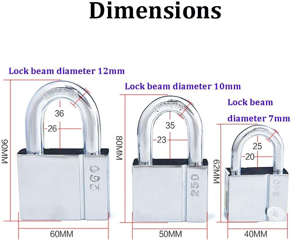 The padlock uses a high-strength zinc alloy lock body, wear-resistant and not easy to rust, stainless steel thick lock beam, shear resistance and difficult to break, Idling lock cylinder, high anti-theft coefficient, suitable for storage cabinets, warehouses, door locks, bicycles, gyms, Garages, fences, etc.Product parameterMaterial: alloy steelLock beam diameter: about 7mm,10mm,12mmSize: about 40x62mm,50x80mm,60x90mm(Width: 1.6in,2in,2.4in)Keys: 3 keysNote: The size is manually measured, there is an error of 1-3mmThe salt spray can withstand 72 hours without obvious oxidationRainproof for 24 hours and can be used normallyThe lock core electric drill is tested for 1 minute, there is no obvious damage, normal usepacking list:1 padlock + 3 keysnote:-Before purchasing the product, please ensure that the size of the shackle of the product meets your requirements.Reminder: If you have any questions, please contact us, we will serve you in time, thank you for your understanding.If you need more styles, please click on our other products to find your favorite style