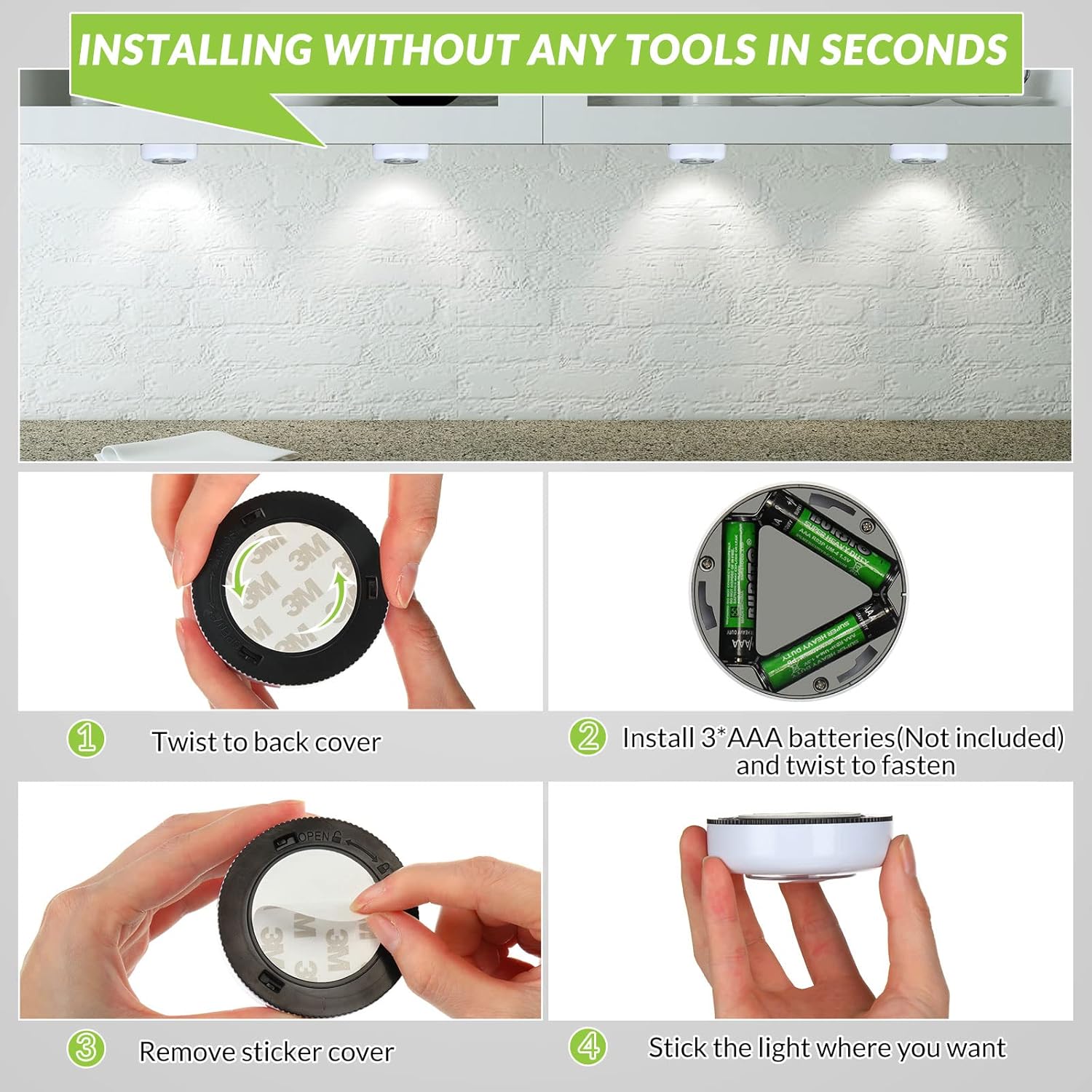 Features: White soft light: The push lights are white soft light, can protect your eyes when reading or looking at electronic devices. Using occasions: These closet LED lights are suitable for bedroom, bathroom, kitchen, stairs, utility room, garage, cabinets, closets and more, can also be applied to camping, party, outdoor music festival, convenient to place or hold. Specifications: Main material: ABS Brightness: 60 lumens Light source type: LED Power: 1 watts Main color: white Light color: white Size: about 2.68 x 0.87 inches/ 6.8 x 2.2 cm Single product weight: about 30 g/ 1.1 oz Power supplies: 3 x AAA batteries (not included) Switch mode: click Package includes: 24 x LED push lights Notes: Manual measurement, please allow slight errors on size. The color may exist a slight difference due to different screen displays.
