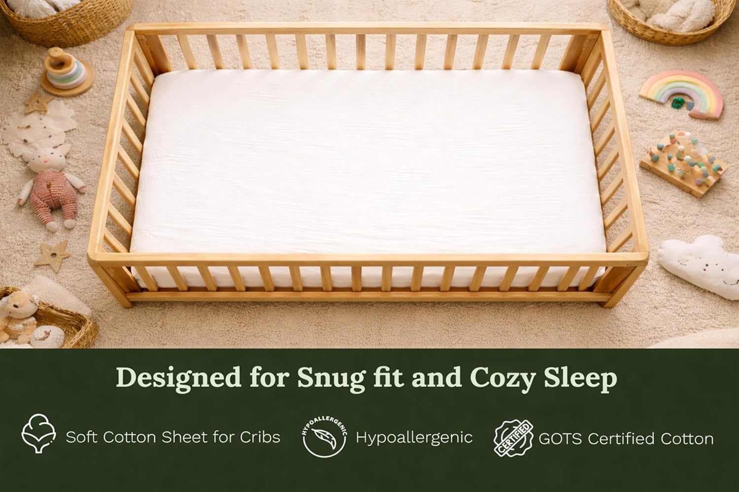 Soft, breathable, and thoughtfully made, these premium organic cotton fitted crib sheets are designed for parents who want a safe, comfortable sleep space without unnecessary hassle. Crafted from 100% GOTS-certified organic cotton, each crib mattress sheet feels naturally smooth, super soft, and gentle against delicate skin. The breathable weave helps distribute airflow evenly, keeping your baby comfortable through naps, nighttime sleep, and seasonal changes. Unlike loose or shifting sheets, these fitted crib sheets are designed to stay in place. The elastic runs securely around standard mattresses, creating a snug fit that won’t bunch, ride up, or slip off — even with active sleepers. Parents absolutely love how easy they are to put on, take off, and wash. These fitted cotton crib sheets are free from harsh dyes and unnecessary treatments, making them a reassuring choice for everyday use. They’re durable enough for frequent washing, yet soft enough to get better with time. At Organic Cotton Mart, every detail is made with care — from the quality of the cotton to the way the sheet fits your baby’s crib. Simple, breathable, and dependable, these organic crib sheets are made to support better sleep for babies and peace of mind for parents.