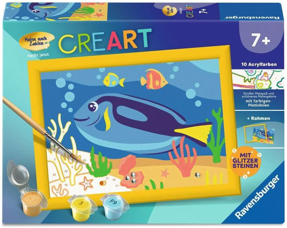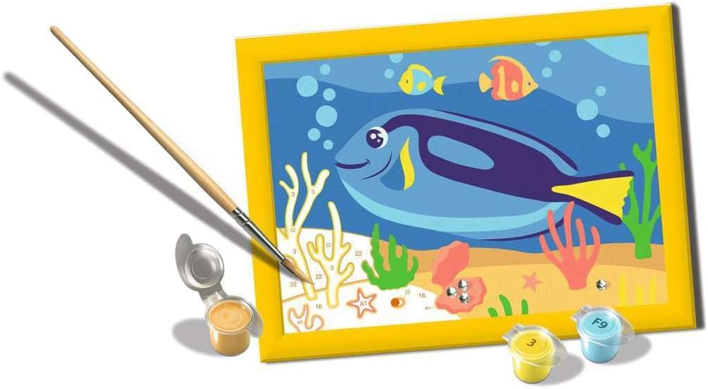 Product Description Coloured motif lines: greater colouring fun and a more beautiful result. Thanks to the coloured motif lines, children can recognise the whole motif doctorfish and the colours faster. The brush has good guidance and thus creates a perfect picture. The beautiful motifs for colouring are a great gift idea for children aged 7 and over and a beautiful decoration. This painting set contains 10 ready-mixed acrylic paints. Packaging design may vary. Manufacturer Contact Information service@ravensburger.de; service@ravensburger.de
