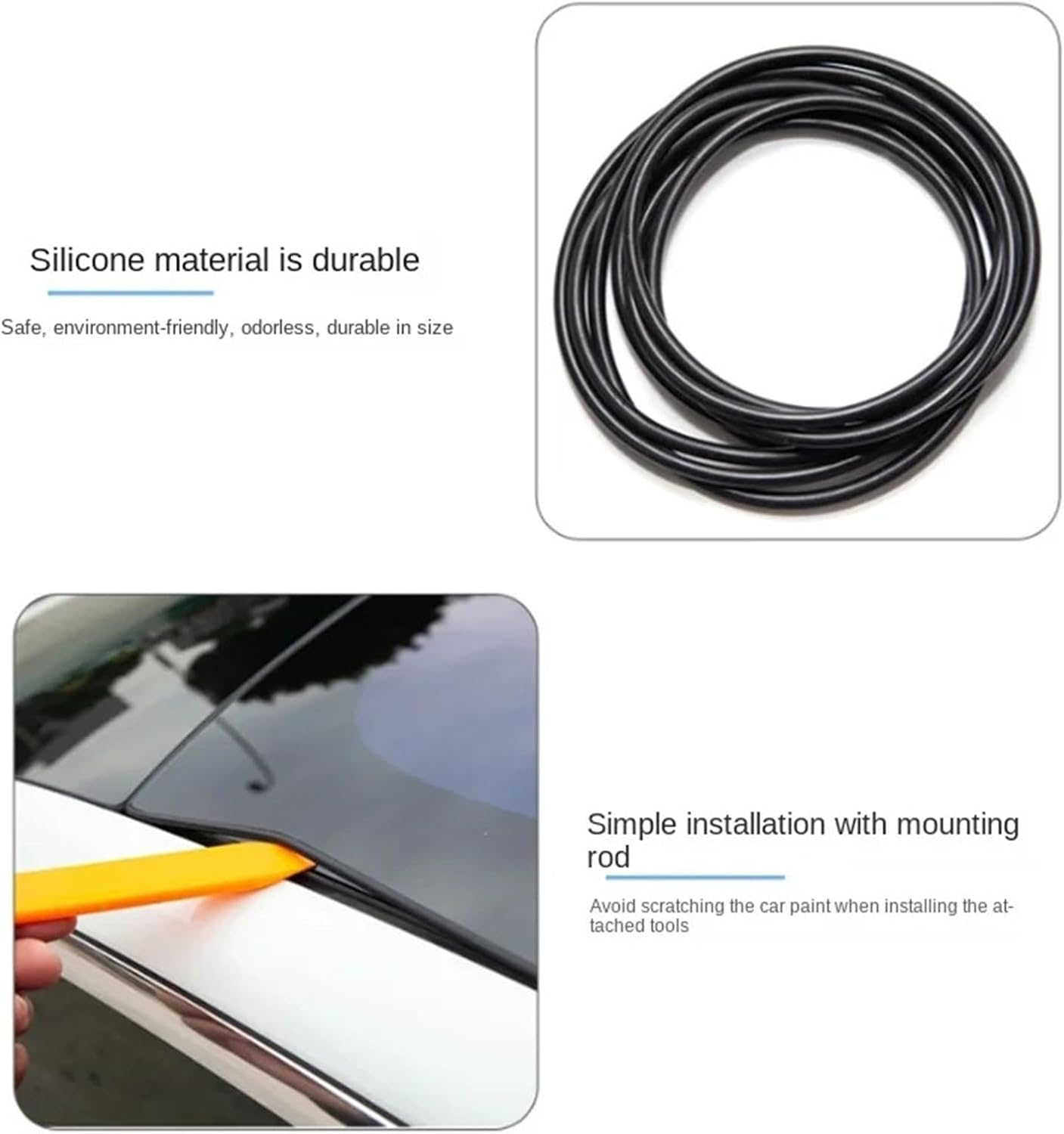 automotive-tailgate-sealsFeatures:No cutting, gluing, taping, sealing, or tools required at all.Installation is no more than 5 minutes and anyone can install this.Drastically reduce wind noise from entering the cabin along with other outside noises. Keeps your car quiet Keeps debris such as leaves / flower petals / even dust from getting stuck in the window seal chink.Specificaitons:Weight: Model 3 about 73 gColor: BlackFeature:Fit for Tesla Model 3 Model YNote:Due to manual measurement,there may be 1-2cm error,hope for understanding.Package Included:1 x Sunroof Rubber Seal Strip1 x ToolMaterial Type : silica gel