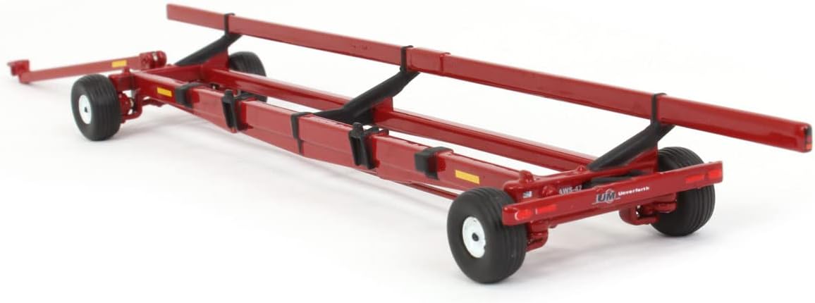 This is a highly detailed 1/64 scale model produced by SpecCast. Its real life counterpart is an Unverferth AWS Fieldrunner Header Trailer. This replica features a red color scheme with exceptional attention to detail and realistic decals. It is made of die-cast metal with some plastic and rubber components and has approximate dimensions of 10in L x 1.625in W x 0.875in H. According to the manufacturer, it is recommended for ages 14+ years, meaning it is for display only and not for play.