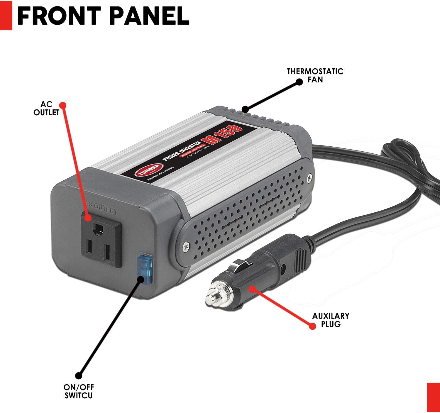 Inverter, Inverter Output Voltage 120V AC, Inverter Input Voltage 12V DC, Nominal Output Power 150 W, Peak Output Power 300 W, Number of Outlets 1, Outlet Type 3-Prong Outlet, DC Connection Cigarette Lighter Input, Height 2.5 in, Width 6.0 in, Depth 8.25 in, Case Material Aluminum