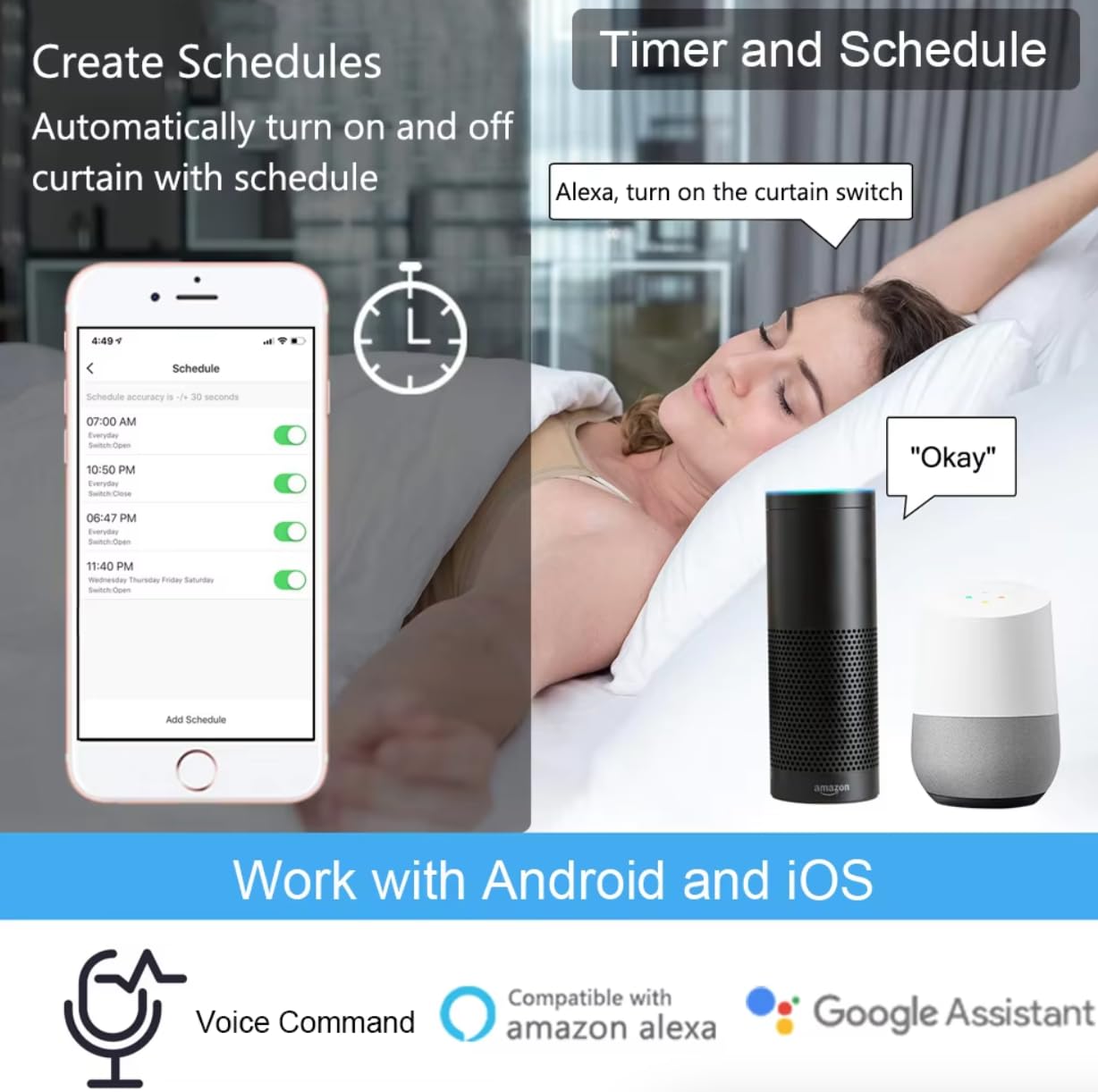 Elevate your home automation experience with this Tuya Smart Life Curtain Switch Module. Effortlessly control your blinds, roller shutters, or curtains using the included remote control or your smartphone via the Tuya Smart Life app. With RF and Wi-Fi connectivity, you can operate your window coverings from anywhere. Schedule timers or integrate with voice assistants like Google Home and Amazon Alexa for hands-free convenience. This module supports input voltages from 100-250VAC, 50/60Hz and can handle loads up to 300W, making it suitable for a wide range of curtain and blind systems. Enjoy the luxury of automated window treatments with this versatile and user-friendly solution.