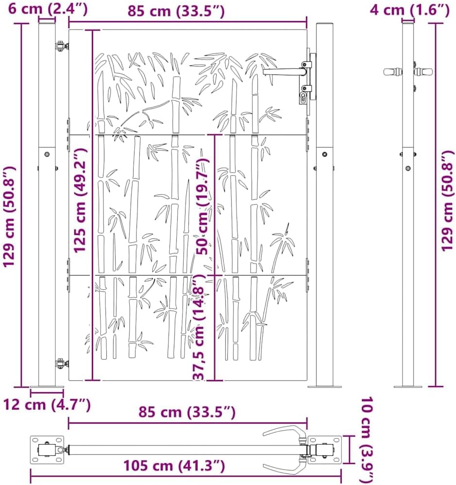 The perfect combination of strength and elegance, this garden gate is an ideal entry point for the fence surrounding the garden or patio. Durable material: The metal door is made of corten steel. Corten steel, also known as weather-resistant steel, is naturally anti-corrosive. Develops a protective layer of rust against corrosion when first exposed to atmospheric conditions. Therefore, it is not necessary to paint it, which avoids maintenance and repair costs. Without a doubt, the distinctive brown colour of corten steel will attract attention. Corten steel is also very durable and will stand the test of time. LASER CUT DESIGN: The side door has a beautiful laser cut out design that gives a unique charm to the house. Lockable system: The metal door is equipped with a locking system for greater security. 【Stable Base】4 mounting holes on the base of the gate post allow you to fix it to the ground for stability. Useful Information: This product must be assembled. When you receive this product, it will still not oxidize and have a normal metallic color, but it will oxidize over time. You can speed up the oxidation process by spraying it with soapy water and salt water. To avoid staining your clothes, avoid contact with the developing oxide layer. Colour: rusty. Material: Corten steel. Overall dimensions: 105 x 130 cm (W x H). Door panel dimensions: 85 x 125 cm (W x H). Pole tube dimensions: 6 x 4 cm (W x D) Post height: 130 cm Assembly Required: Yes