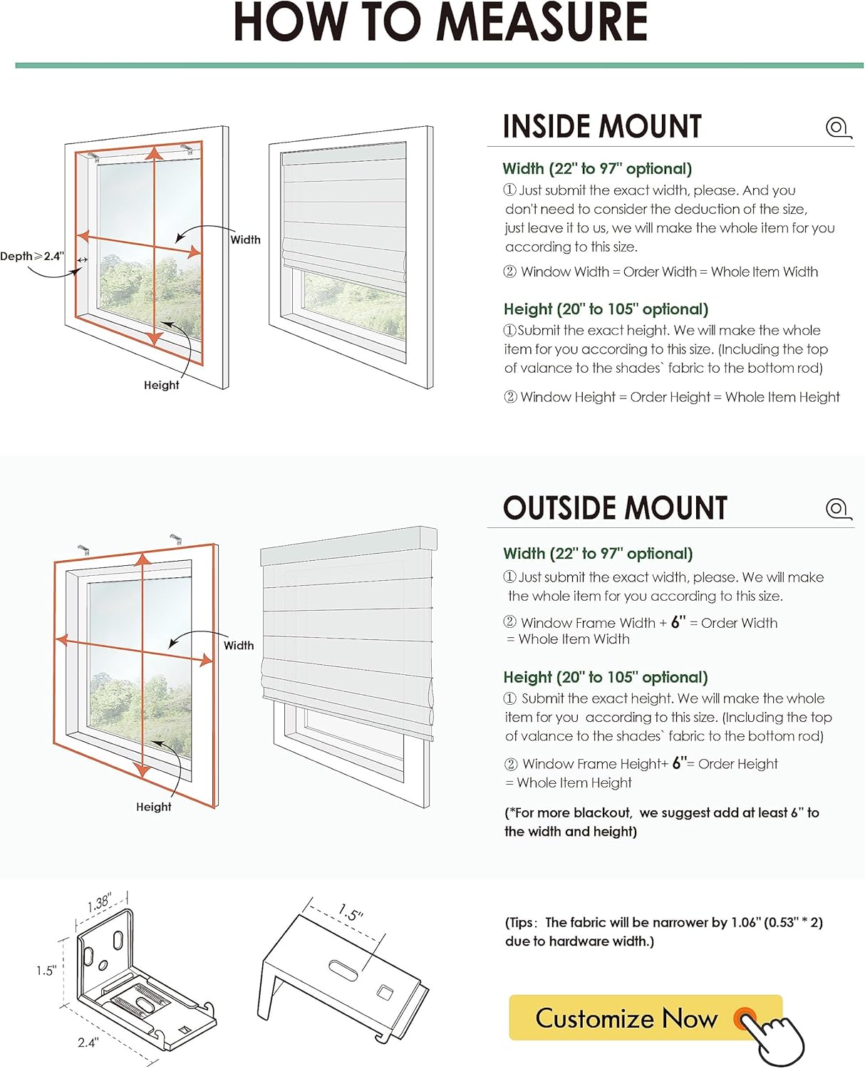 | Mounting Type | Inside Mount, Outside Mount |