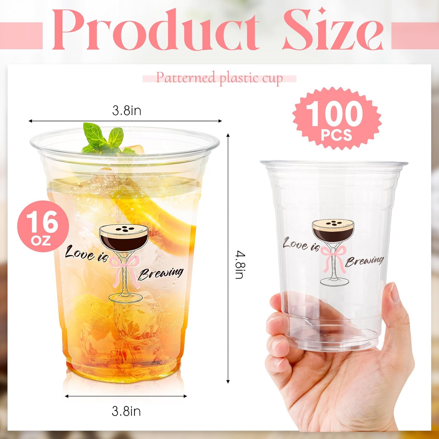 Features: Ideal for bridal showers, wedding mornings, brunch parties, bachelorette celebrations, or any romantic gathering where you want your drinks served in style. Save time on cleanup, impress your guests with chic design, and enjoy the perfect combination of fun, style, and convenience for memorable celebrations. Feature an elegant “Love is Brewing” martini design, made from sturdy yet disposable plastic. They're perfect for cocktails, mocktails, and espresso martinis. Specifications: Material: PET plastic Main Color: clear Capacity: 16 oz Package includes: 100 X 16oz love is brewing cups Notes: Manual measurement, please allow slight errors on size. The color may exist a slight difference due to different screen displays