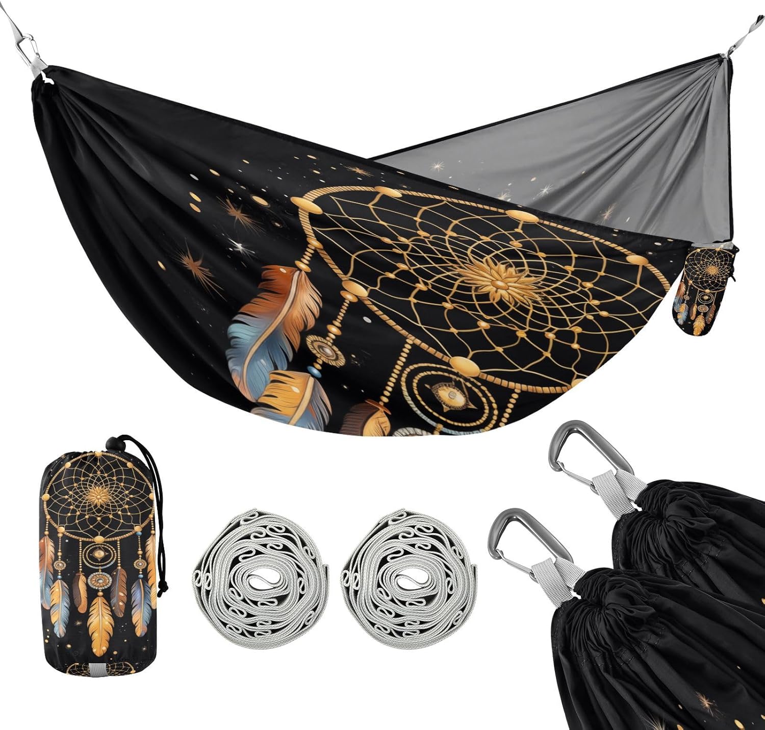 Reliable Outdoor Relaxation This practical hammock delivers comfort and convenience for outdoor enthusiasts using quality materials and thoughtful engineering. Technical Details Material: 100% polyester (210T taffeta body; 600D polyester straps) Hardware: Aluminum carabiners Load Capacity: 500 lbs (227 kg) Packed Size: Approx. 7 x 5 inches (18 x 13 cm) Durable Construction Reinforced triple-stitched seams at stress points Quick-drying material Practical Applications Camping and backpacking Hiking rest breaks Beach and park outings Family relaxation Travel and festivals Package Includes 1. Hammock 2. Straps (2m each) 3. Carabiners 4. Storage sack Designed for Easy Use Sets up in minutes without tools. The balanced design provides stable support, while the breathable fabric prevents overheating during extended use.