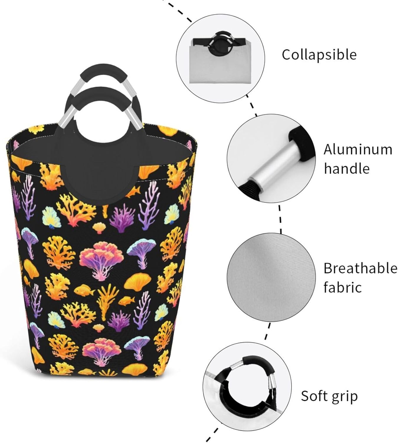 Our Coral Reef Pattern dirty clothes storage bag is made of polyester, which is lightweight and flexible. It can maintain a stable shape even under heavy pressure and collision. At the same time, the incorporation of Oxford cloth material significantly improves the durability of the product, and it is resistant to wear, bumps and pulling. The storage bag is designed with a large capacity, which can easily carry winter clothes, daily clothes and a variety of sundries. It is easy to carry and store, and fits tightly into the gap of the suitcase after folding. The aluminum handle is sturdy and reliable, supports hanging, and is suitable for a variety of places. In terms of design, it adopts leak-proof technology, combined with waterproof coating and precision sewing, which is effectively waterproof. The exterior uses cutting-edge transfer technology, and a PE board support is added at the bottom to ensure stable load-bearing and prevent tipping. This storage bag is practical and easy to use, and is an ideal choice for travel and home.