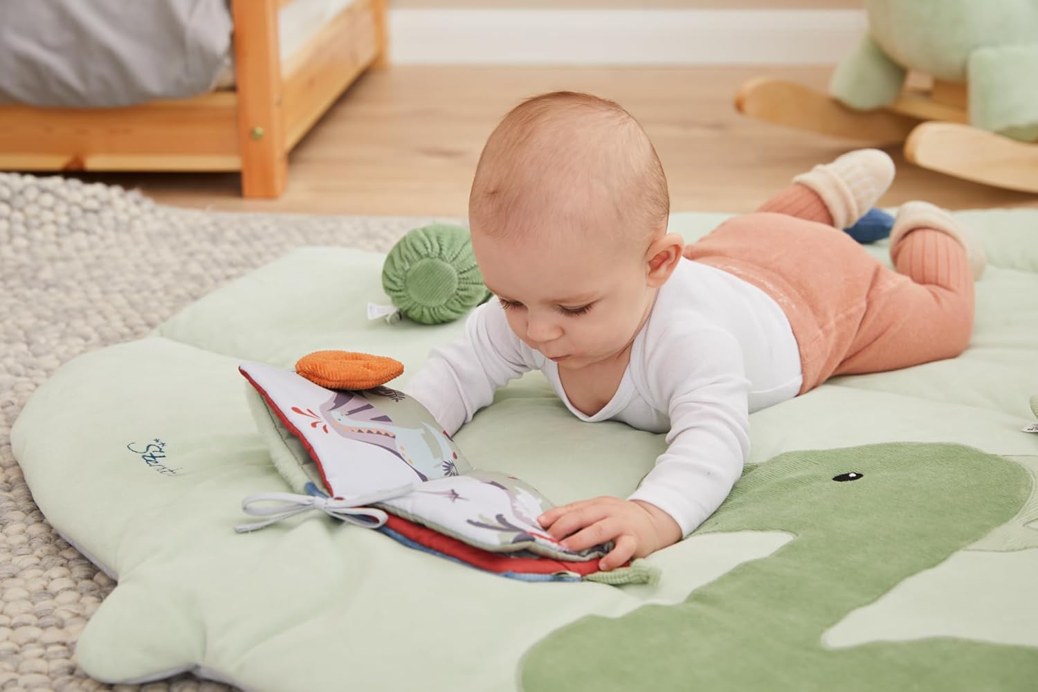 DINO Rexi play book, extra soft dinosaur application, padded, with drawstring for easy attachment to a stroller or other match, rearview mirror, crumpled paper and squeaker to discover