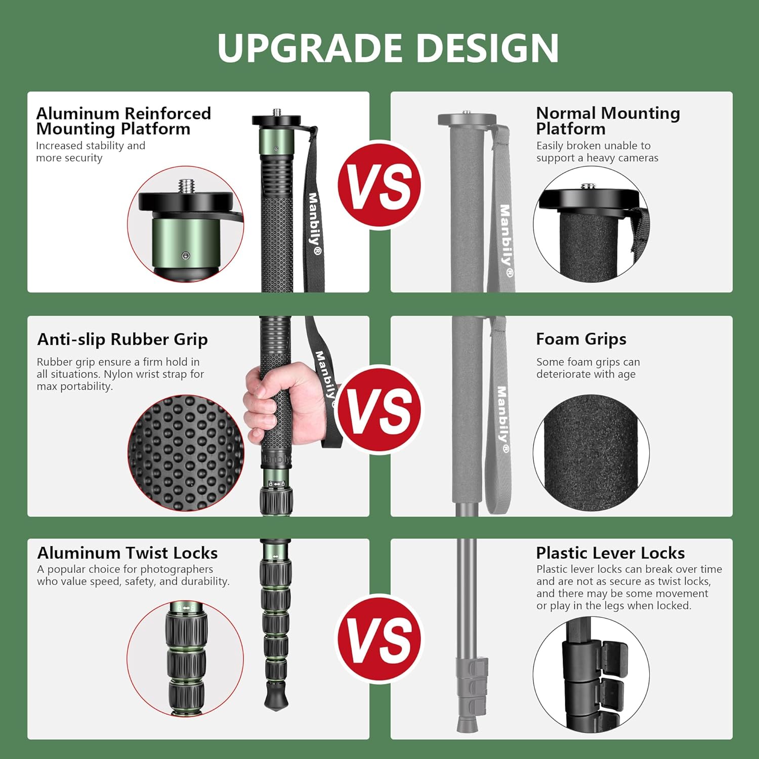 Model: Manbily A-555L Color: green Material: Aluminum Product Weight: 1.1 lb/0.49kg Maximum Load Capacity: 15.4 lb/7kg Maximum Height: 61in/155cm Folded Height : 15.7 inches/40cm Number of Leg Sections: 6 sections Locking Type: Twist lock Maximum Tube Diameter: 28mm Minimum Tube Diameter: 13mm Mounting Thread: reversible 1/4" & 3/8" screw In The Box: 1 x Monopod 1 x Carry Bag 1 x Walking Stick Handle 1 xScrew Cap 1 x Allen Key 1 x Manual