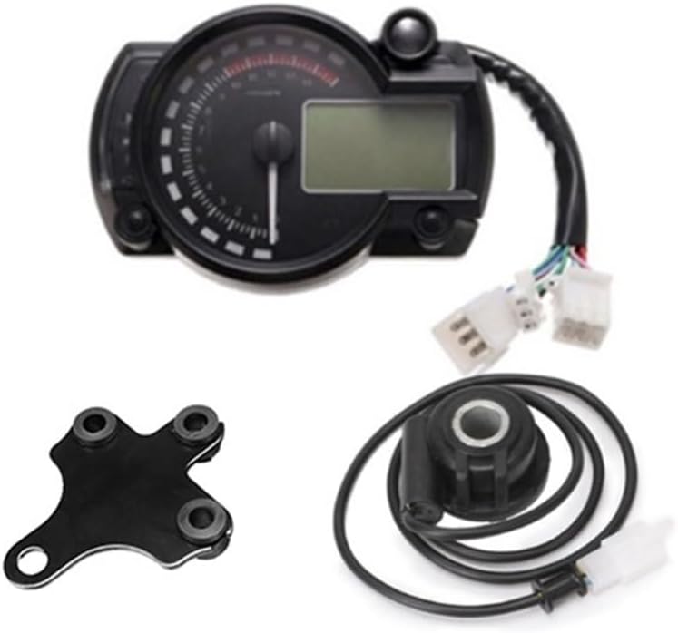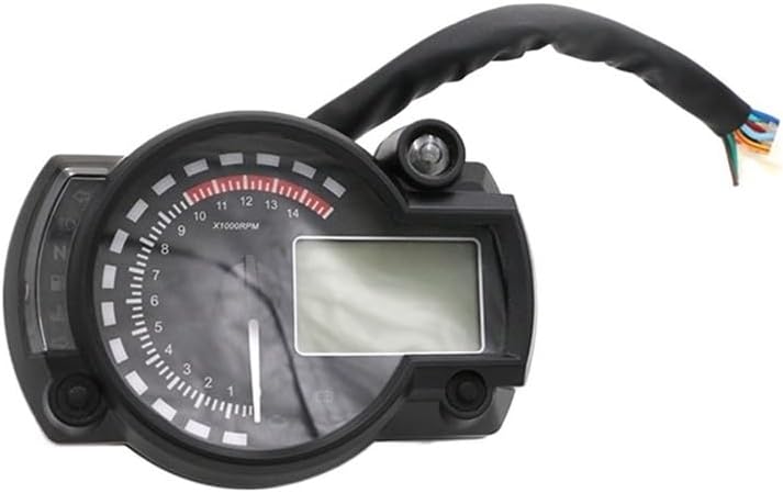 The Motorcycle Meter Display Speedometer craftsmanship, sturdy and durable, not easy to damage, reliable quality, can bring you a comfortable experience.Universal Digital Motorcycle For RX2N Odometer Speedometer Meter Instrument Adjustable MAX 299KM/H 7 Colors DashboardCross-country motorcycle general instrument modified seven-color adjustable speed electronic digital mileageMultiple functions in item: This motor meter has tachometer, speedometer and gear indicator, and all the parts are combined in item, so it is a high performance kit for motorcycleSpeed sensor: There is a speed sensor designed on the motor meter, and this design can ensure its high working and professional performanceEasy to check data in darkness: Anti-glare backlight display, easily viewing at all angles during lighting conditions or in the darknessAdjustable 7 types of color: The screen has 7 types of color in total, and they are adjustable by pressing the right button under ODO condition, so this is a great add-on decoration for your motorcycleDescription:This is a digital Speedometer integrated with Tachometer and Gear Indicator, with display which shows the rotational speed and gear precisely. Thus, do not hesitate to take to enhance your safety.Color: blackSize: 140 * 99mm / 5.5 * 3.9inSpeed Sensor Cable Length: approx.125cm / 49.2inSpeed Sensor Size(L * D): 40 * 12mm / 1.6 * 0.5inWorking Voltage: DC 12VSpeed Display Range: 0~299km/h(mile)Odometer Display Range: 0~99999.9km(mile)Trip Meter: max.999.9kmGear Position: 1 to 6Backlight Color: nomally color is blue, 7 colors adjustablePackage List:1 * Motorcycle Speedometer1 * Speed Sensor2 * Magnets