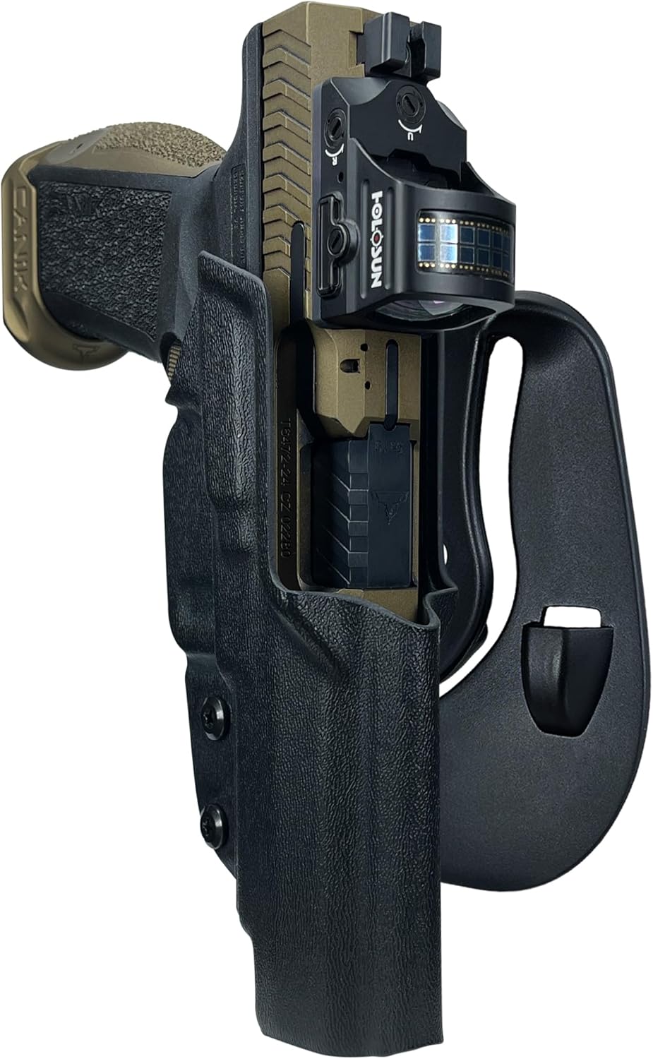 The OWB Paddle Holster is the perfect choice for gun enthusiasts looking for a comfortable, reliable, and versatile holster option. Crafted with premium materials, this holster is designed to provide a secure fit for your firearm, ensuring maximum retention and easy access when you need it. The holster features an adjustable paddle attachment that allows you to easily and securely attach the holster to your waistband, providing a comfortable and secure fit. The holster is made from .80'' Kydex and the OWB Paddle is made from durable polymer materials that are both lightweight and strong, ensuring the holster can withstand the rigors of daily use. Whether you're a law enforcement officer, military personnel, or a responsible gun owner, our OWB Paddle Holster is a must-have accessory for any firearm enthusiast.