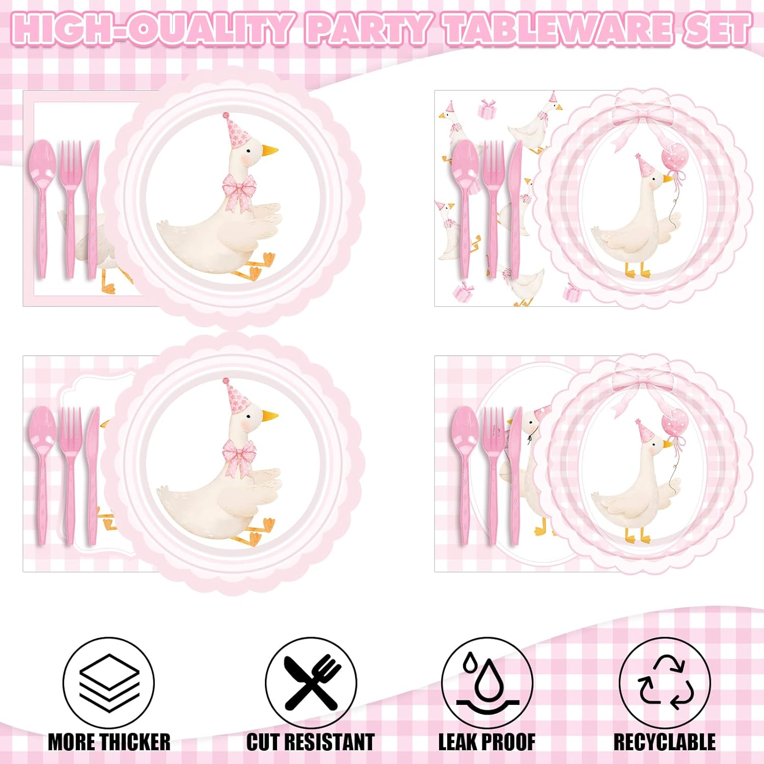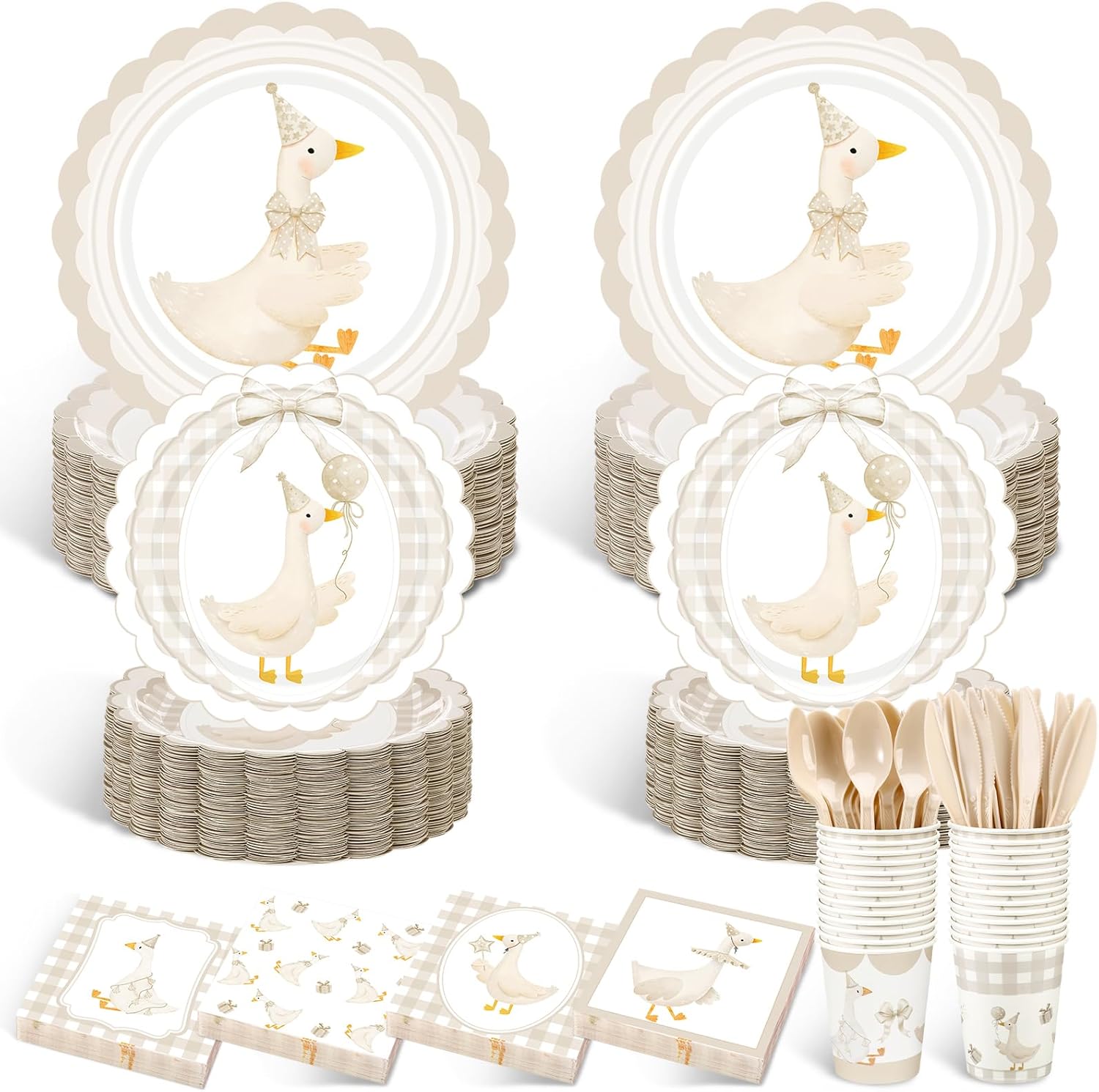 Features: Simplify your party preparations with this comprehensive set. Everything you need for a stylish and seamless celebration is right here, making your event planning enjoyable. Infuse your gathering with charm with these cute pink silly goose designs. They not only enhance the visual appeal of your table setting but also contribute to a heartwarming and memorable atmosphere for all your guests. Specifications: Material: paper, plastic Color: pink, white Size: Plates: 7 inches, 9 inches Cups: 9 oz Napkins: 6.5 inches Package includes: 100 x Silly goose plates 50 x Pink cups 50 x Silly goose napkins 50 Sets of plastic cutlery Notes: Manual measurement, please allow slight errors on size. The color may exist a slight difference due to different screen displays. Do not microwave.